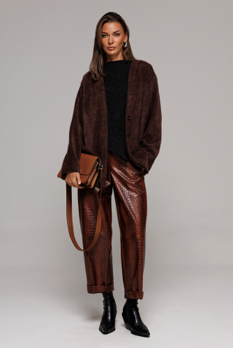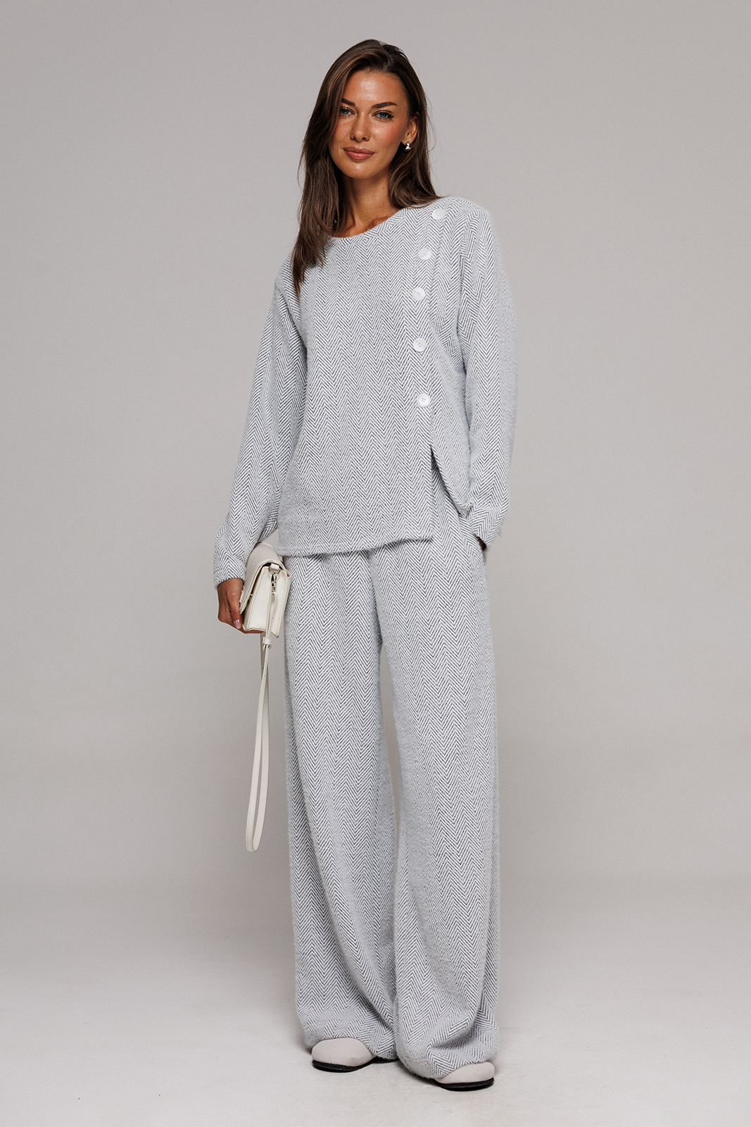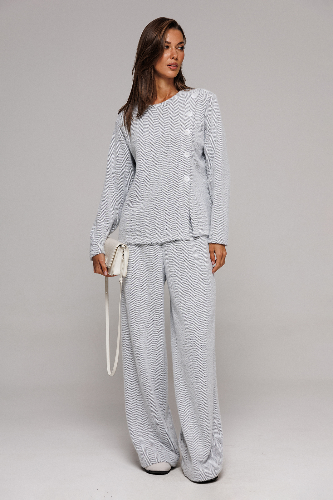 Костюм состоит и 2-ух предметов: джемпера и брюк. Джемпер из трикотажного полотна прямого силуэта со спущенной линией плеча. Рукав втачной. По переду имитация диагональной застежки на петли-пуговицы. По горловине планка из основной ткани. Брюки на цельнокроеном отстроченном поясе со вставленной в него резинкой. Брюки прямого силуэта с карманами в боковых швах. 70% ПЭ, 30% полиамид