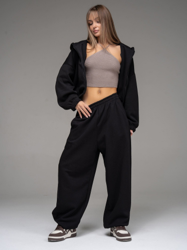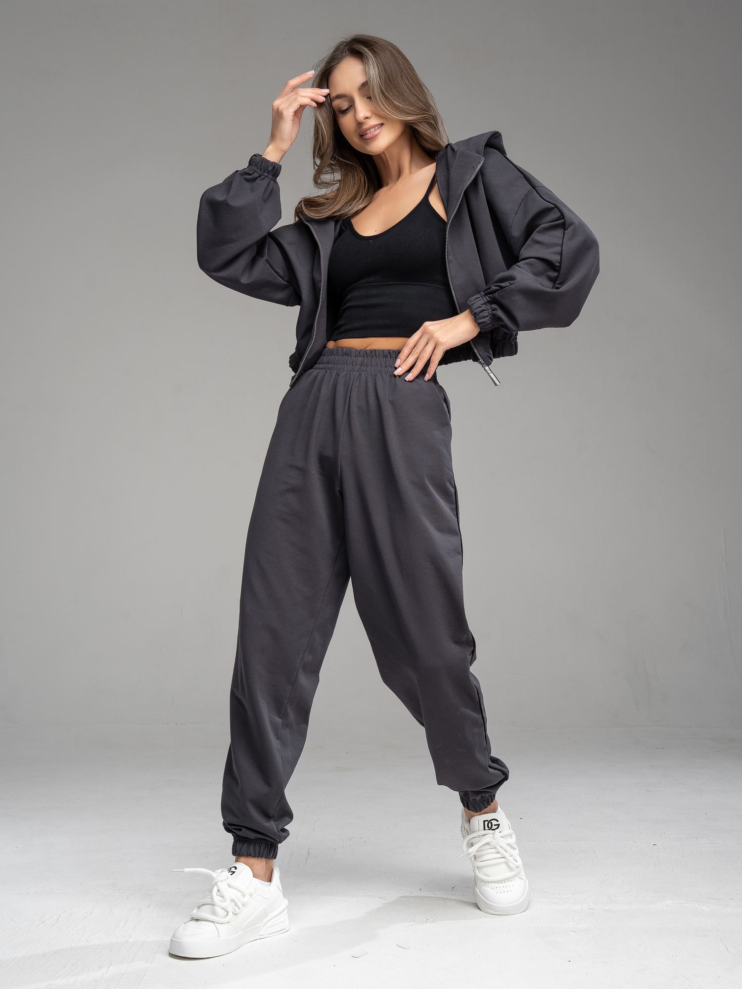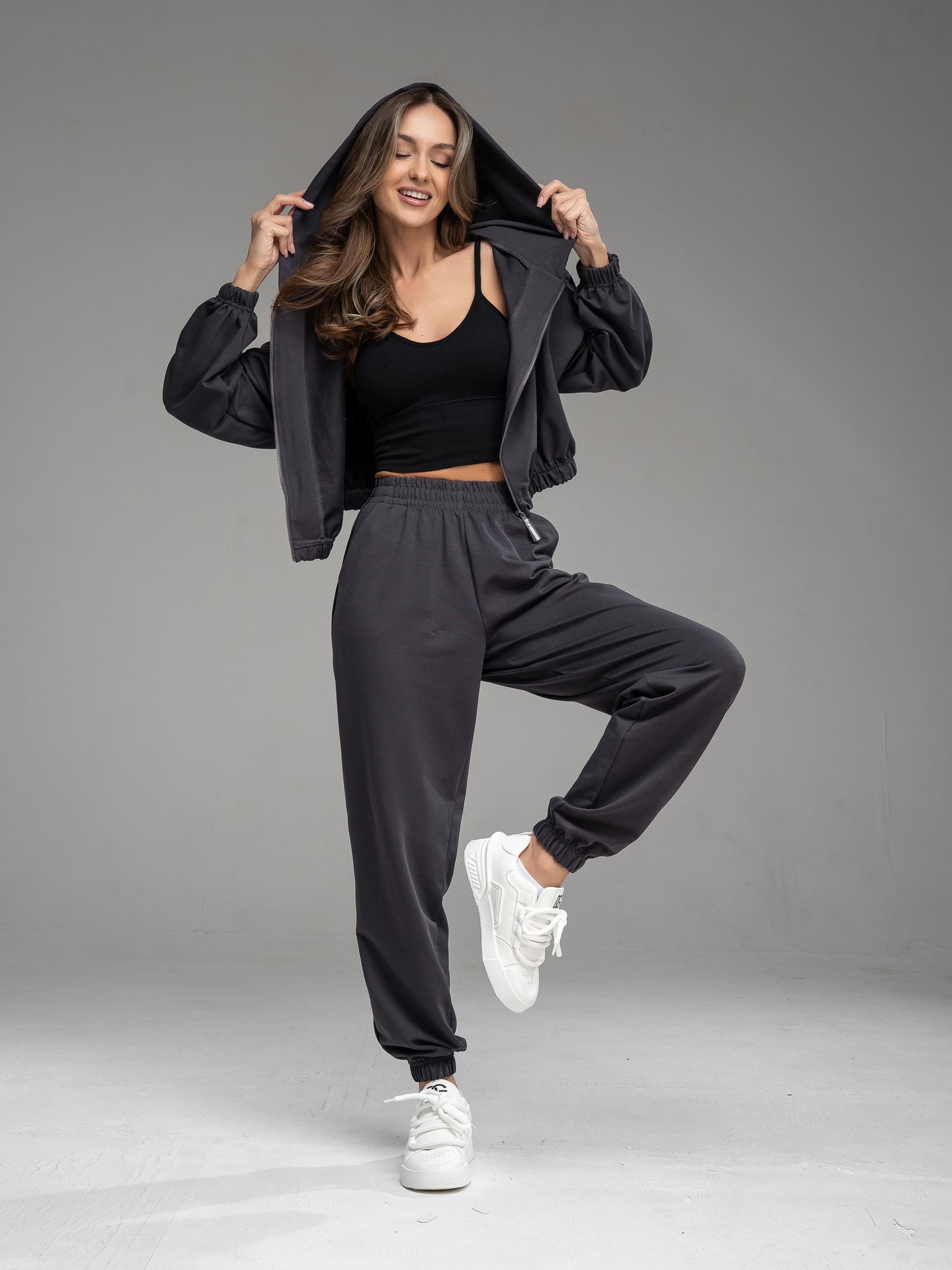 Женский костюм из футера антрацитового цвета без начеса,с стиле "Спорт-шик" состоящий из брюк и кофты с капюшоном на молнии. Толстовка укороченная на молнии свободного силуэта с капюшоном и длинными рукавами. Низ рукавов и толстовки- на резинке. По плечевому шву вставлен отделочный кант. Брюки свободного силуэта с боковыми карманами, по талии и низу изделия- резинка. В боковой шов вставлен отделочный кант. Универсальный спортивный костюм женский для повседневной жизни, выполнен из хлопкового футера 2х нитки (без начеса)- ткань средней плотности, подойдет на весну и осень, (демисезон) и прохладное лето. Наш трикотажный брючный костюм подойдет для занятий спортом, фитнеса, пилатеса, танцев и йоги. Так же в качестве спортивной формы для занятия спортом. Спортивный комплект послужит прекрасным вариантом для прогулок и походов. Хлопковая свободная двойка прекрасно смотрится на девушках разного типа фигуры и благодаря свободной кофте оверсайз подойдет и беременным девушкам. Повседневный трикотажный комплект прекрасно впишется в любой гардероб, т.к. штаны и кофту можно сочетать с любыми вещами из гардероба! Кофту на молнии и спортивки можно носить по отдельности, сочетая их с различными элементами спортивной и повседневной одежды. Плотное трикотажное полотно футер 2-х нитка без начеса, гладкое снаружи, изнутри - мягкое и приятное. В состав хлопковой ткани для эластичности и износостойкости добавлен полиэстер. Он универсален! И в поездке или путешествии будет незаменимым вариантом как на улицу, так и в спортзал. Наша стильная спортивная новинка станет удачным подарком подруге, сестре или любимой девушке на день рождения и любой другой праздник. Изделие выполнено из трикотажа премиального качества - ПЕНЬЕ, с содержанием хлопка более 92%