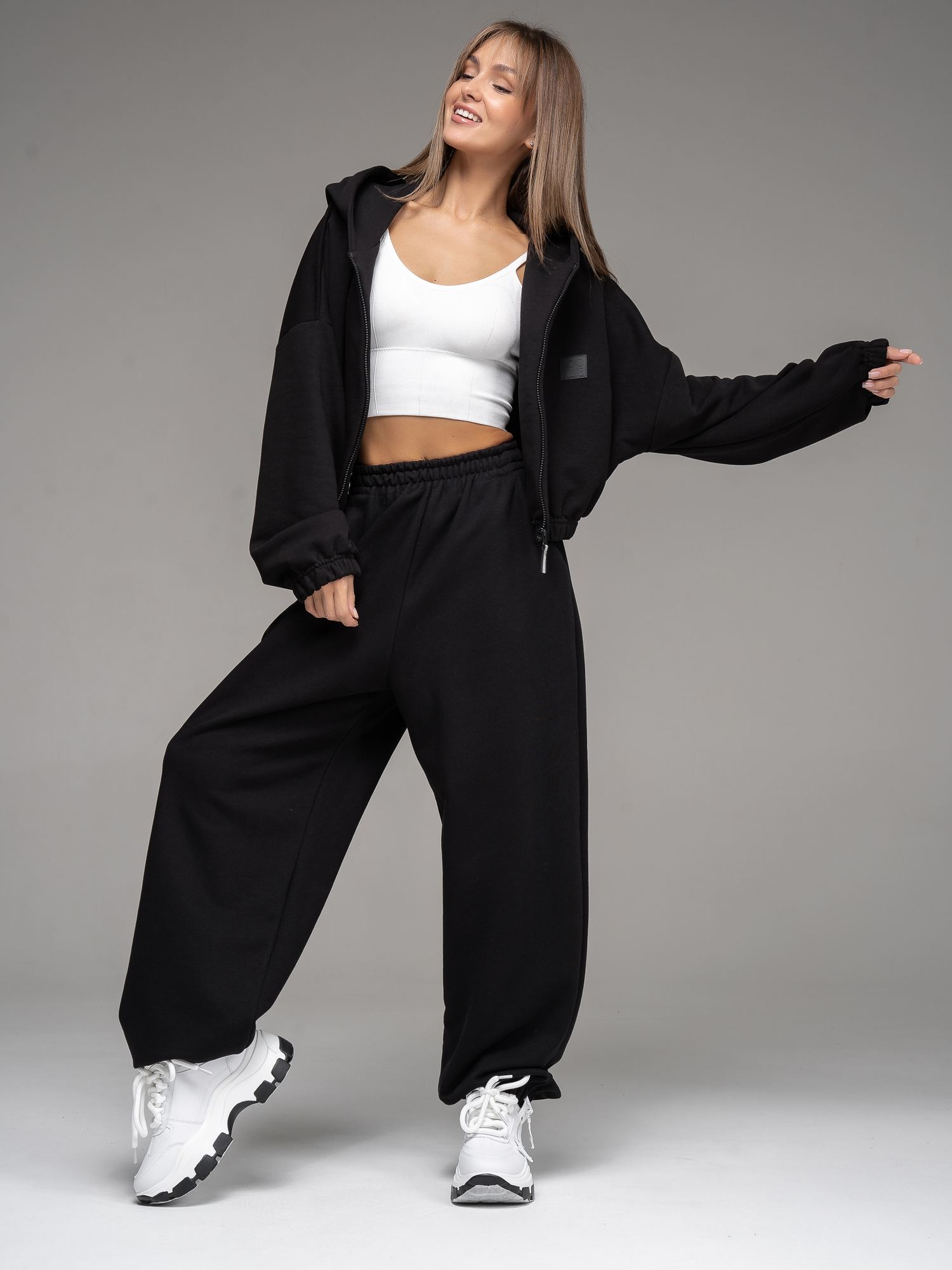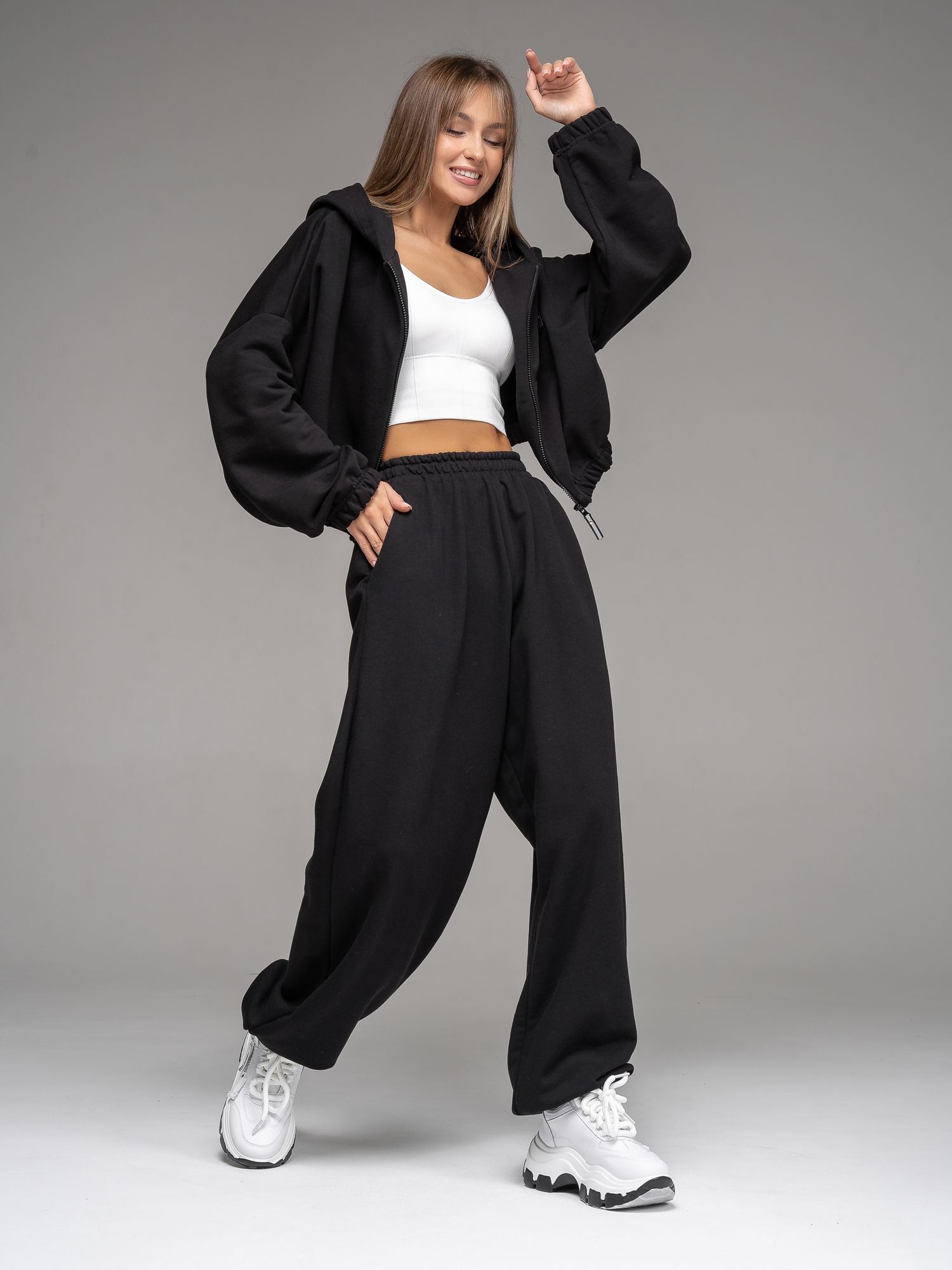 Женский костюм из футера(3х нитка) черного цвета без начеса,с стиле "Спорт-шик" состоящий из брюк и кофты с капюшоном на молнии. Толстовка укороченная на молнии свободного силуэта с капюшоном и длинными рукавами. Низ рукавов и толстовки- на резинке. Брюки свободного силуэта с боковыми карманами, по талии и низу изделия- резинка. Универсальный спортивный костюм женский для повседневной жизни, выполнен из хлопкового футера 3х нитки (без начеса)- ткань средней плотности, подойдет на весну и осень, (демисезон) и прохладное лето. Наш трикотажный брючный костюм подойдет для занятий спортом, фитнеса, пилатеса, танцев и йоги. Так же в качестве спортивной формы для занятия спортом. Спортивный комплект послужит прекрасным вариантом для прогулок и походов. Хлопковая свободная двойка прекрасно смотрится на девушках разного типа фигуры и благодаря свободной кофте оверсайз подойдет и беременным девушкам. Повседневный трикотажный комплект прекрасно впишется в любой гардероб, т.к. штаны и кофту можно сочетать с любыми вещами из гардероба! Кофту на молнии и спортивки можно носить по отдельности, сочетая их с различными элементами спортивной и повседневной одежды. Плотное трикотажное полотно футер 3-х нитка без начеса, гладкое снаружи, изнутри - мягкое и приятное. В состав хлопковой ткани для эластичности и износостойкости добавлен полиэстер. Он универсален! И в поездке или путешествии будет незаменимым вариантом как на улицу, так и в спортзал. Наша стильная спортивная новинка станет удачным подарком подруге, сестре или любимой девушке на день рождения и любой другой праздник.