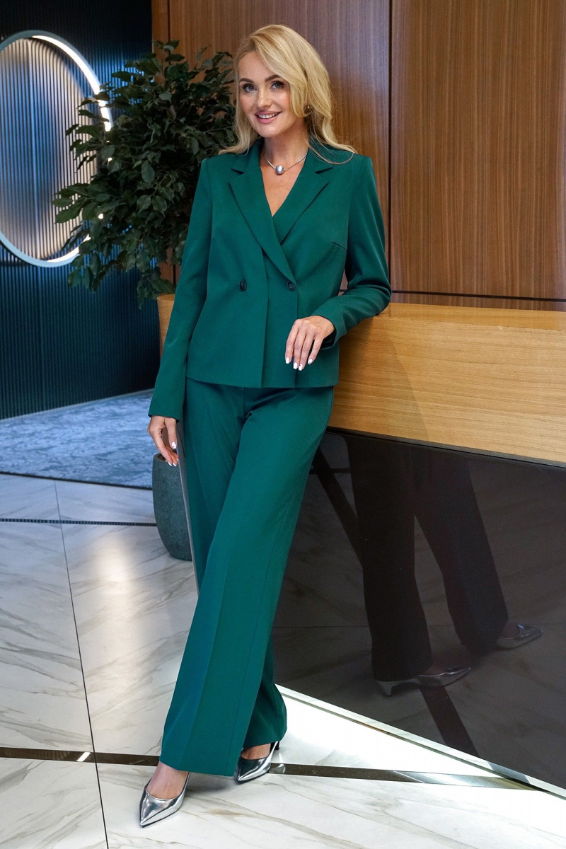 Жакет прямого силуэта, с двухбортной застёжкой на петлю, пуговицу и имитацией центральной застёжки и внутренняя застёжка на петлю, пуговицу. Перед с нагрудными выточками. Спинка со средним швом. Рукава втачные, двухшовные, длинные. Воротник пиджачного типа с отложными лацканами.