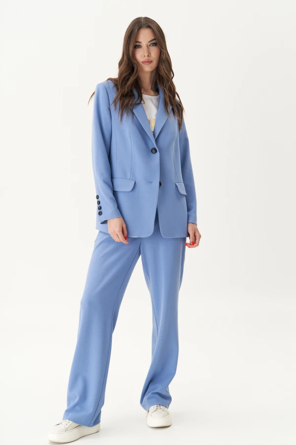 Выбирая стиль кэжуал в одежде, Вы выбираете простоту, понятность и комфорт. Это стиль уверенных, успешных и активных, а его вариативность позволяет создавать из базового комплекта множество современных образов.Жакет свободного силуэта, втачного покроя с классическим английским воротником. Полочка с центральной застёжкой, отрезным бочком, нагрудной вытачкой и прорезным карманом с клапаном. Спинка с центральным швом и плечевой вытачкой. Рукав двухшовный с отлётной шлицей по локтевому шву.Брюки классические со стрелками в мужском стиле. По передним половинкам мягкая складка и боковой наклонный карман, по задним - прорезные листочки. Пояс с притачными шлёвками, застёгивающийся на потайные крючки.Длина жакета около 70 см, длина рукава около 60 см. Длина брюк около 104 см
