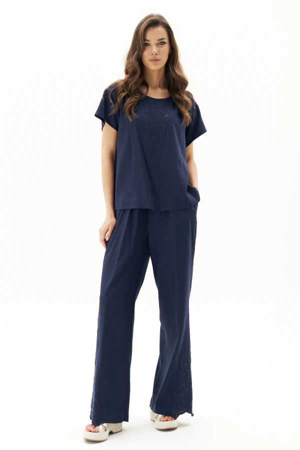 Брючный костюм из смесового льняного полотна с эффектной вышивкой. Он позволяет без усилий создать гармоничный образ, подчёркивая все ваши достоинства и минимизируя те особенности фигуры, которые вам хотелось бы скрыть.Комфортные брюки в расслабленном стиле на эластичном поясе с наклонными боковыми карманами и эффектными коническими вставками по боковому шву из вышитого полотна.Блуза свободная, покрой с заниженной линией плеча, рукав свободный, круглый вырез горловины и коническая вставка по центру переда.Спинка с центральным швом и застежкой- каплей. Низ изделия - разноуровневый.Длина брюк около 104 см.Длина блузы около 67 см.Длина рукава 12 см.