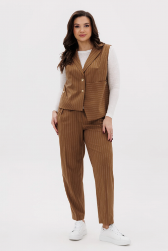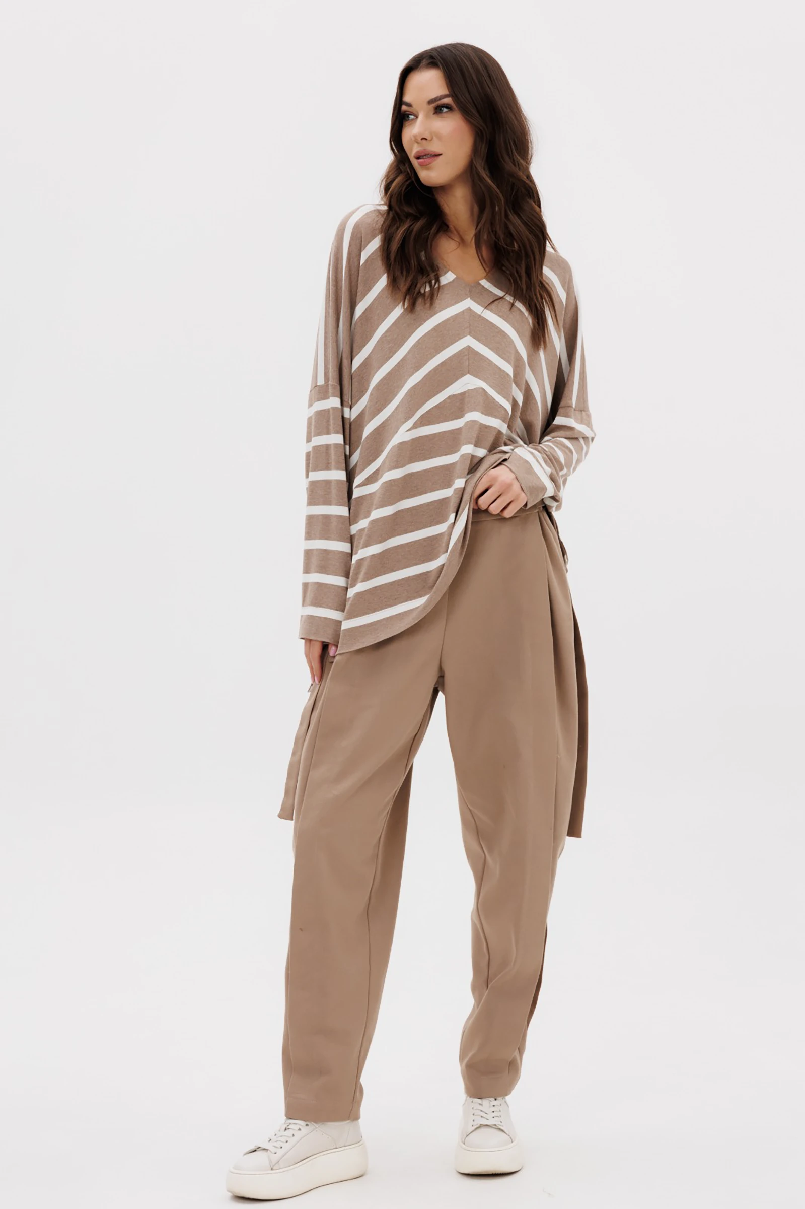 Этот брючный комплект-максимум стиля и практичности. Его легко можно "разобрать" на составные части и сочетать с другими вещами. Он акцентирует внимание на вашей индивидуальности и делает комфорт приоритетам! Свободный упрямленный джемпер в полоску из трикотажа и супер трендовые брюки из хлопкового габардина. Джемпер упрямленный, с заниженной линией плеча, боковыми разрезами и разноуровневым низом.