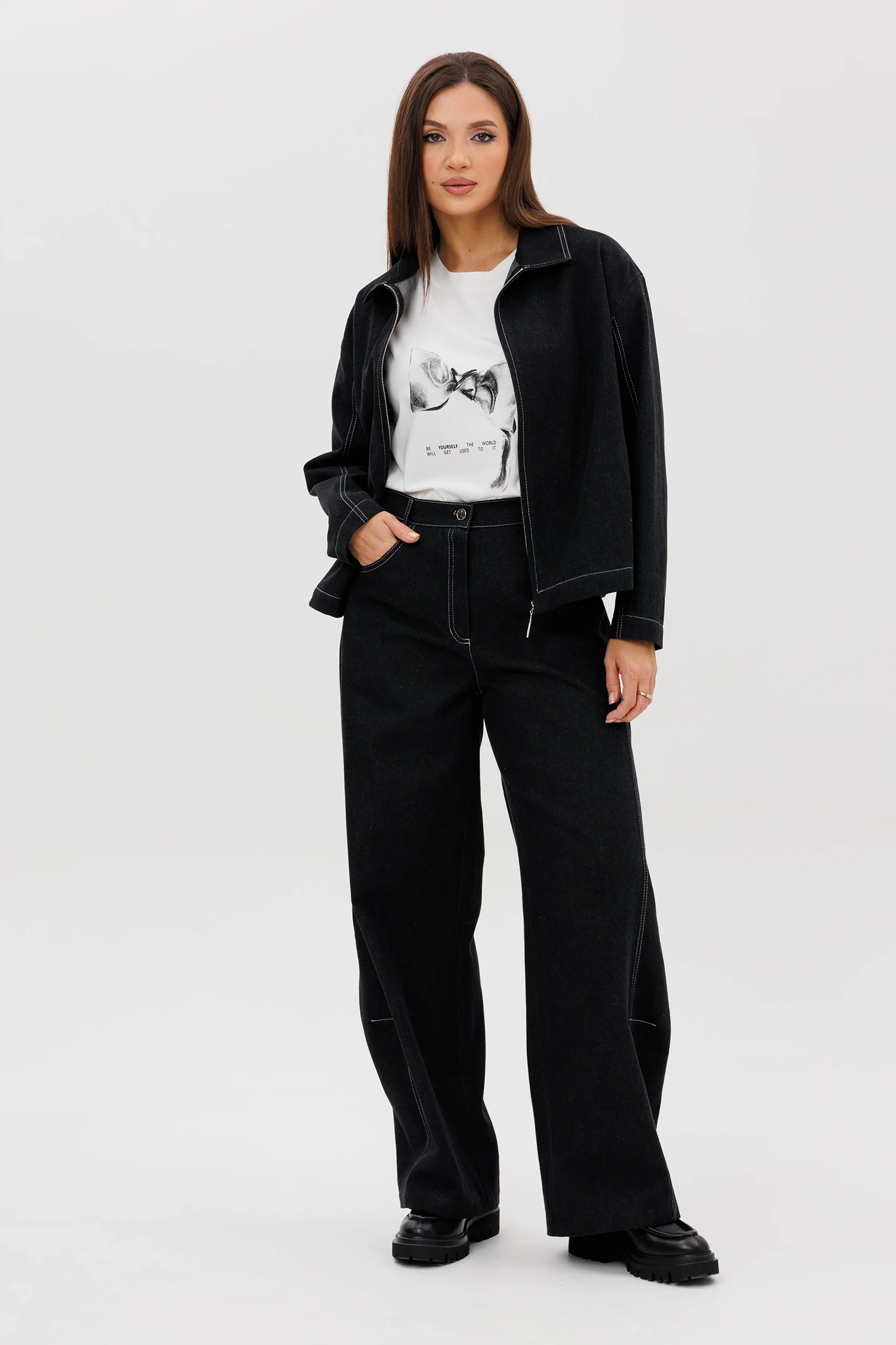 "Самой практичной удобной и функциональной женской одеждой по праву считается джинсовый костюм. Этот вариант обеспечивает максимальный комфорт в носке и идеально вписывается в современный образ.   Куртка джинсовая, свободного силуэта, рубашечного покроя с втачным воротником и центральной застежкой на тесьму молнию. Полочка с боковым рельефом и карманом в нем. Спинка с уентральным швом и эластичной тесьмой по низу. Рукав двухшовный, с регулирующими кнопками в области локтевого шва.