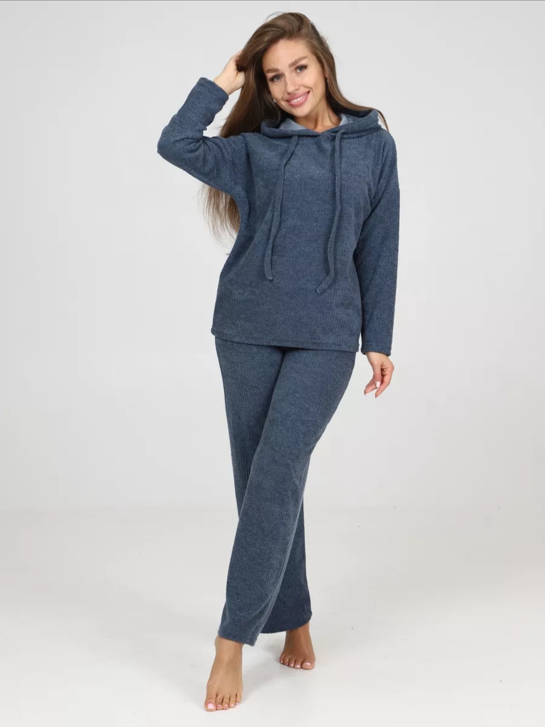 Махровый костюм в рубчик - это великолепное сочетание уюта, тепла и стиля, которое идеально подходит для дома. Костюм состоит из худи свободного кроя с длинным рукавом со спущенным плечом и брюк прямого кроя с карманами.