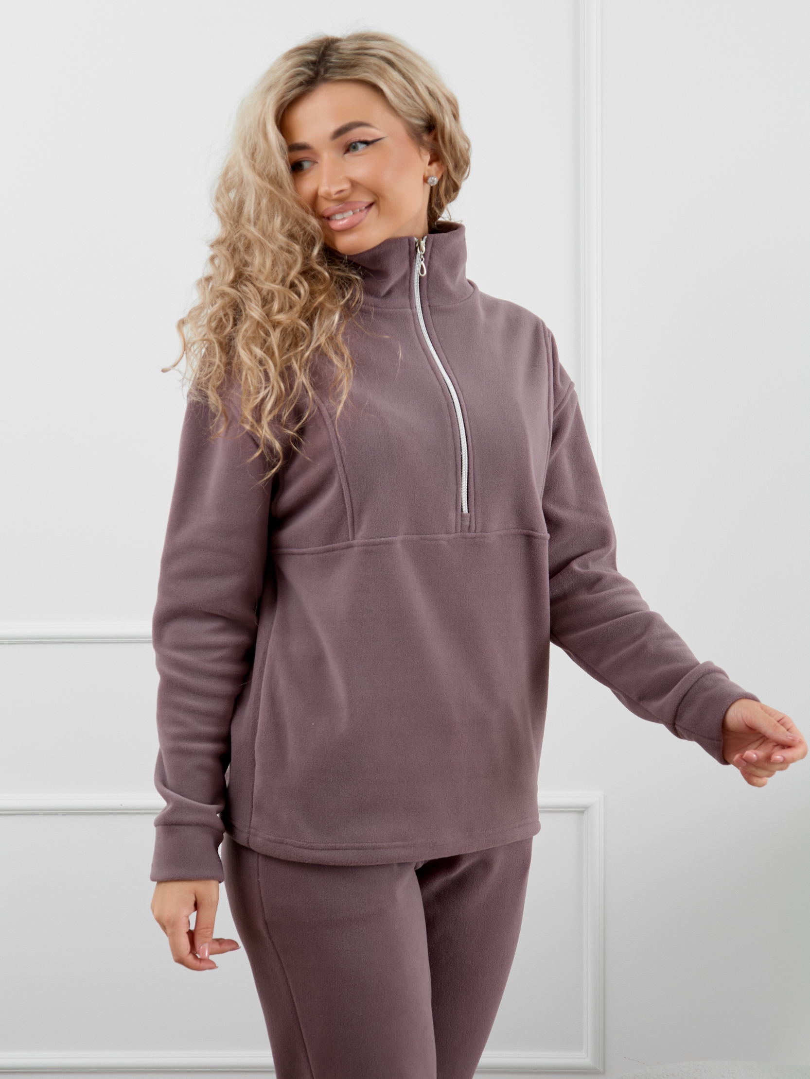 Женский флисовый костюм состоит из толстовки с воротником-стойкой на молнии и брюк джогеров. Костюм сидит свободно и не сковывает движения, что делает его идеальным вариантом для активного образа жизни.