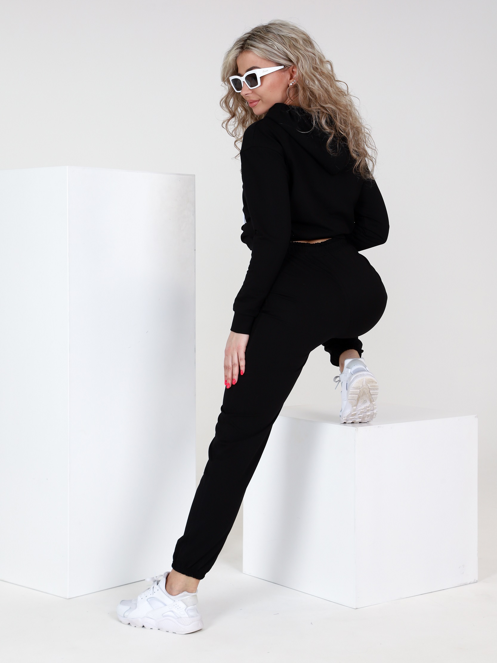 Брюки джоггеры с высокой посадкой и карманами, внизу брючин резинка. Костюм выдержан в спортивном стиле, что позволяет носить его в различных обстоятельствах. Он уместен в кафе, на прогулке в парке или на спортивной площадке.