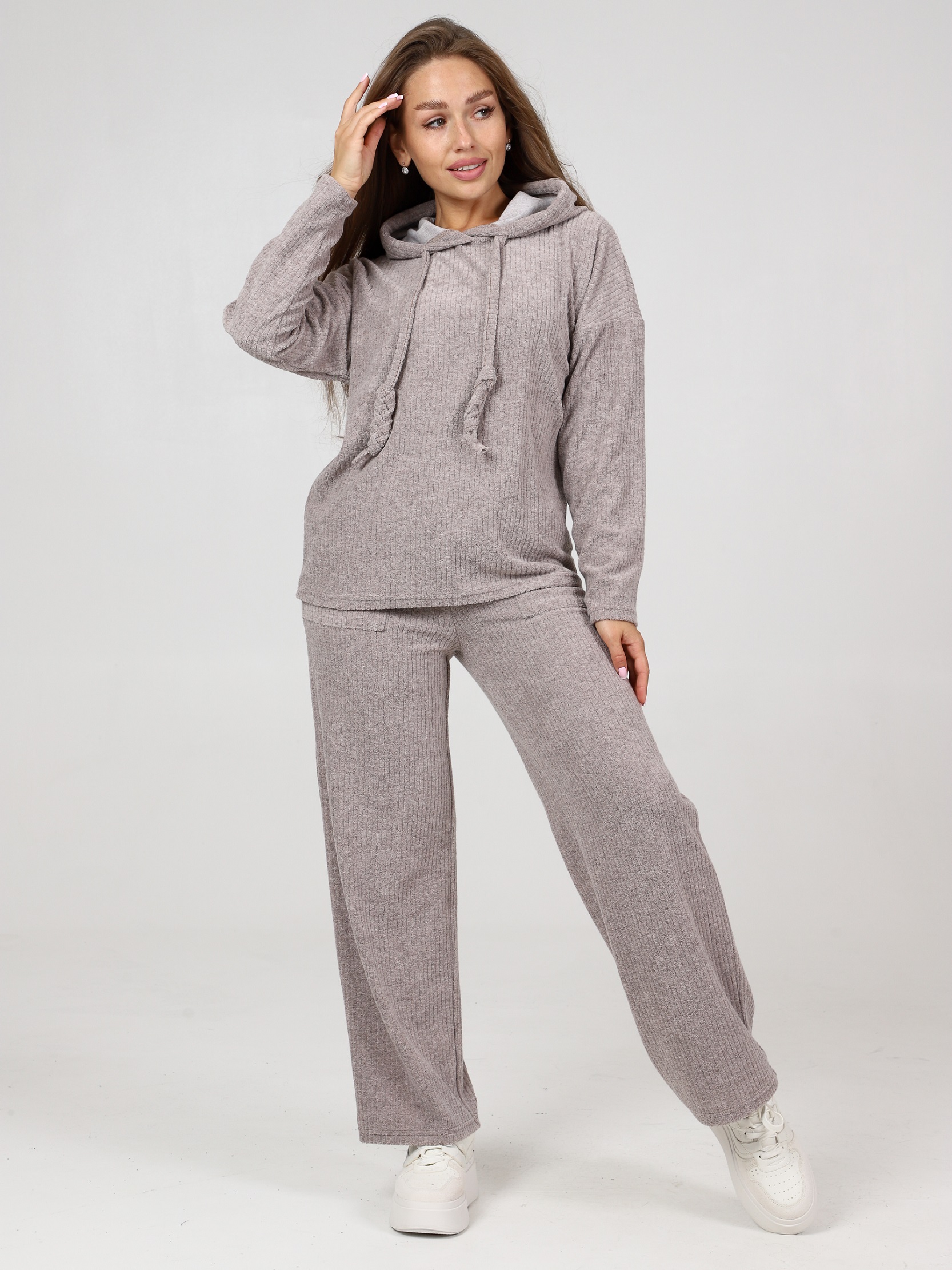 Махровый костюм в рубчик - это великолепное сочетание уюта, тепла и стиля, которое идеально подходит для дома. Костюм состоит из худи свободного кроя с длинным рукавом со спущенным плечом и брюк прямого кроя с карманами.