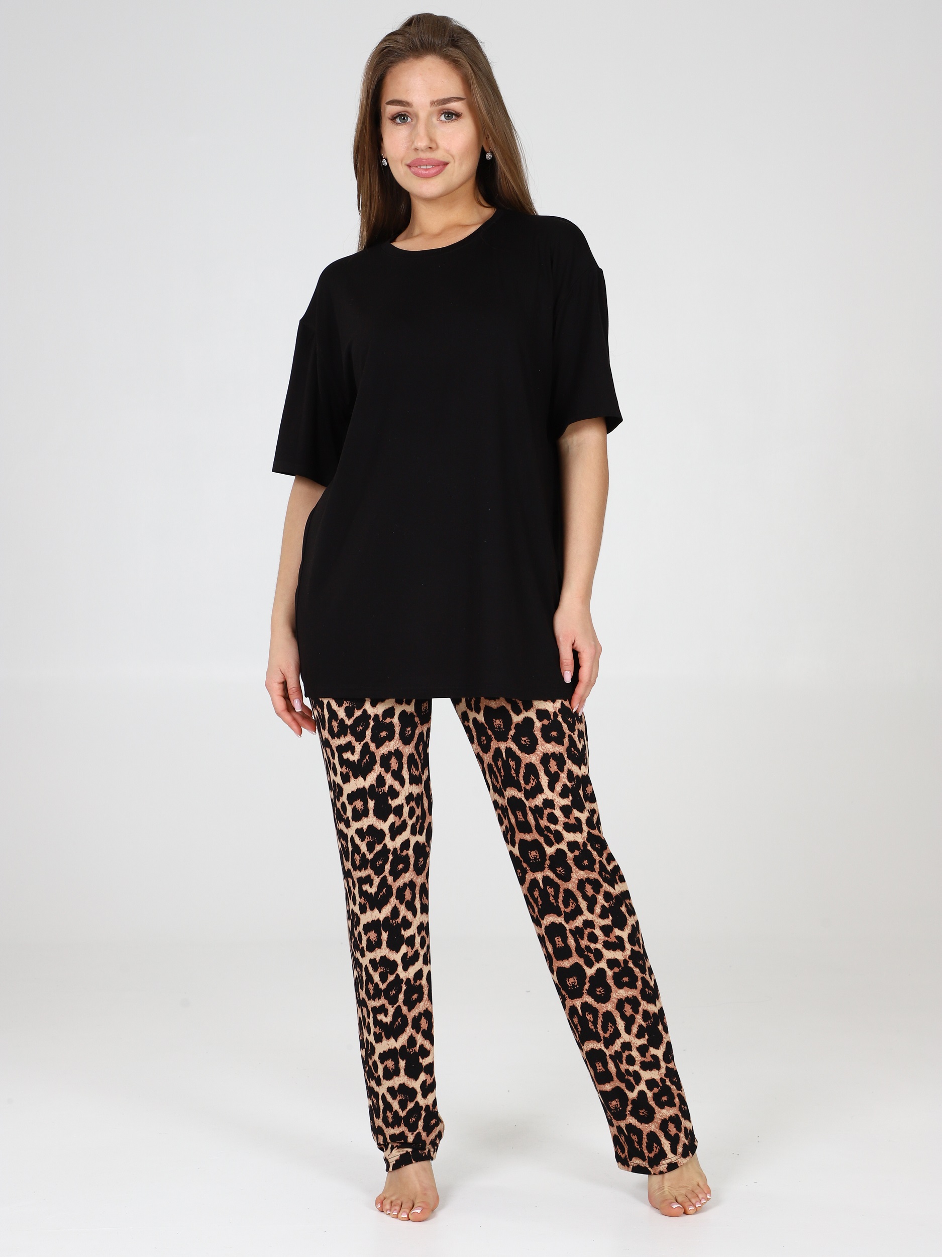 Костюм для женщин состоит из удлиненной футболки в стиле oversize и брюк. Модная свободной формы футболка со спущенным рукавом и прямые брюки с посадкой по талии будут незаменимыми вещами в путешествии , а также заменят пижаму и домашнюю одежду на даче.