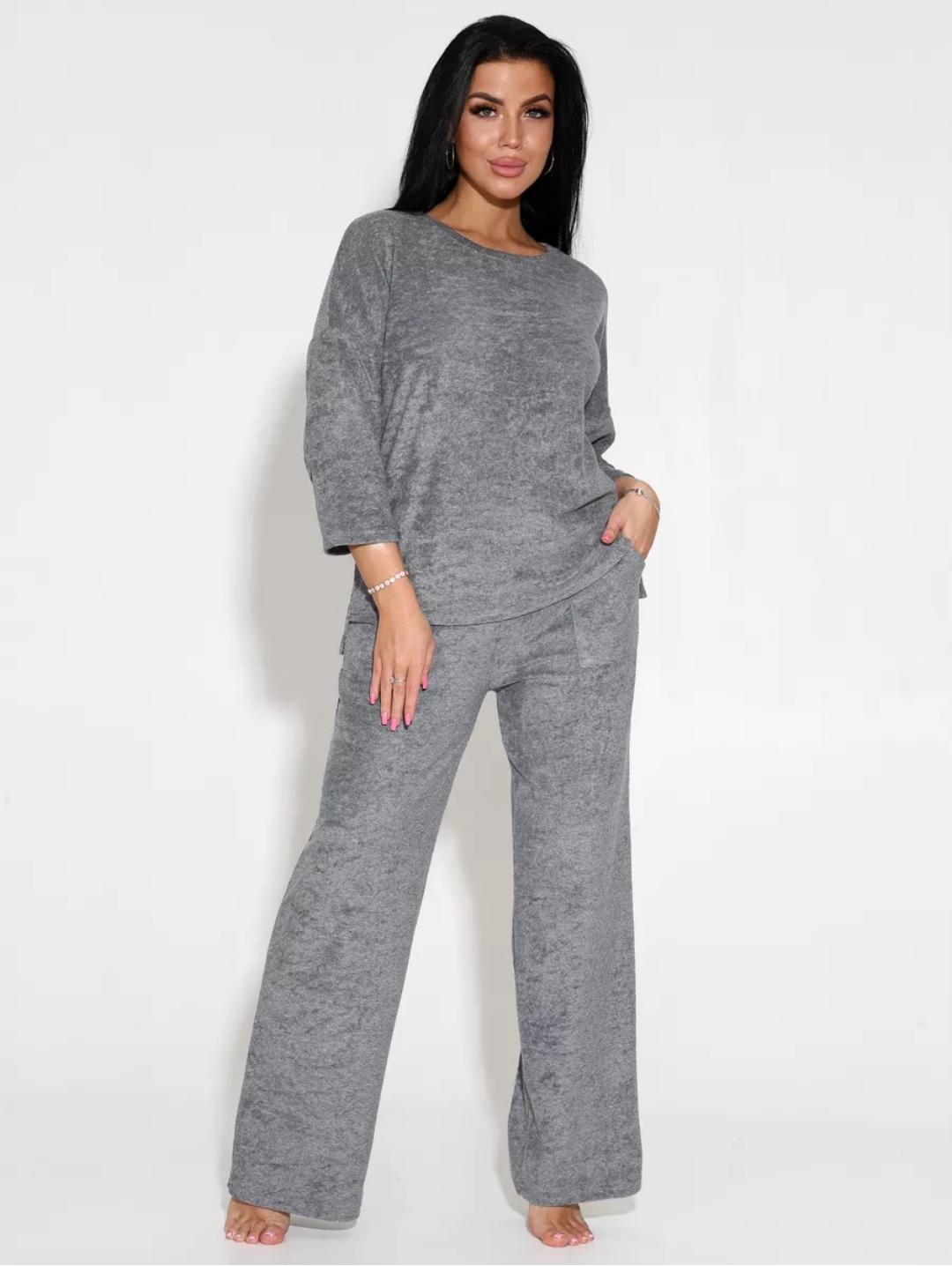 Костюм с кофтой и брюками-палаццо прекрасно подойдет в качестве костюма для дома. Джемпер со спущенным рукавом 3/4 и удлиненной спинкой. Брюки свободного кроя, с карманами. На поясе брюк - контрастная резинка.