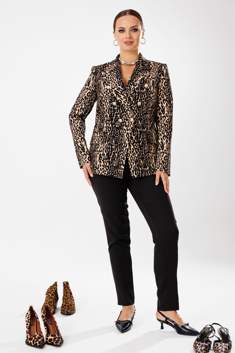 Жакет полуприлегающего силуэта, выполнен из костюмной ткани (чуть тянется) с модным принтом «Леопард», на подкладке. По переду талиевые вытачки, отрезной бочок, функциональные прорезные карманы с клапаном, центральная двубортная застежка на петли-пуговицы. Горловина оформлена глубоким V-образным вырезом и широким воротником пиджачного типа. Спинка со средним швом. Рукава втачные, двухшовные со шлицами и отделочными пуговицами. Маленьким акцентом ультрамодного жакета являются стильные металлические пуговицы.