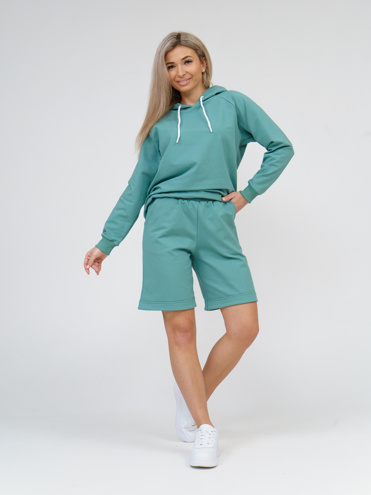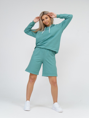 Женский спортивный костюм в стиле оверсайз. Костюм сидит чуть свободно, если любите оверсайз - советуем взять на размер больше. Стильный, модный и комфортный костюм состоит из толстовки и шорт выполненных из высококачественного футера 2х-нитка. Шорты с широкой резинкой и карманами в боковых швах могут прекрасно сочетаться с лонгливами, топами и свитшотами.