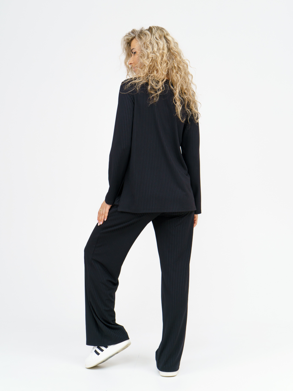 Ткань комплекта - это тонкий, мягкий, легкий трикотажный материал с вискозой, не закатывается, не линяет. Комплект состоит из двух частей - прямые свободных брюк в стиле кэжуал и удлиненного лонгслива с разрезами кроя оверсайз.