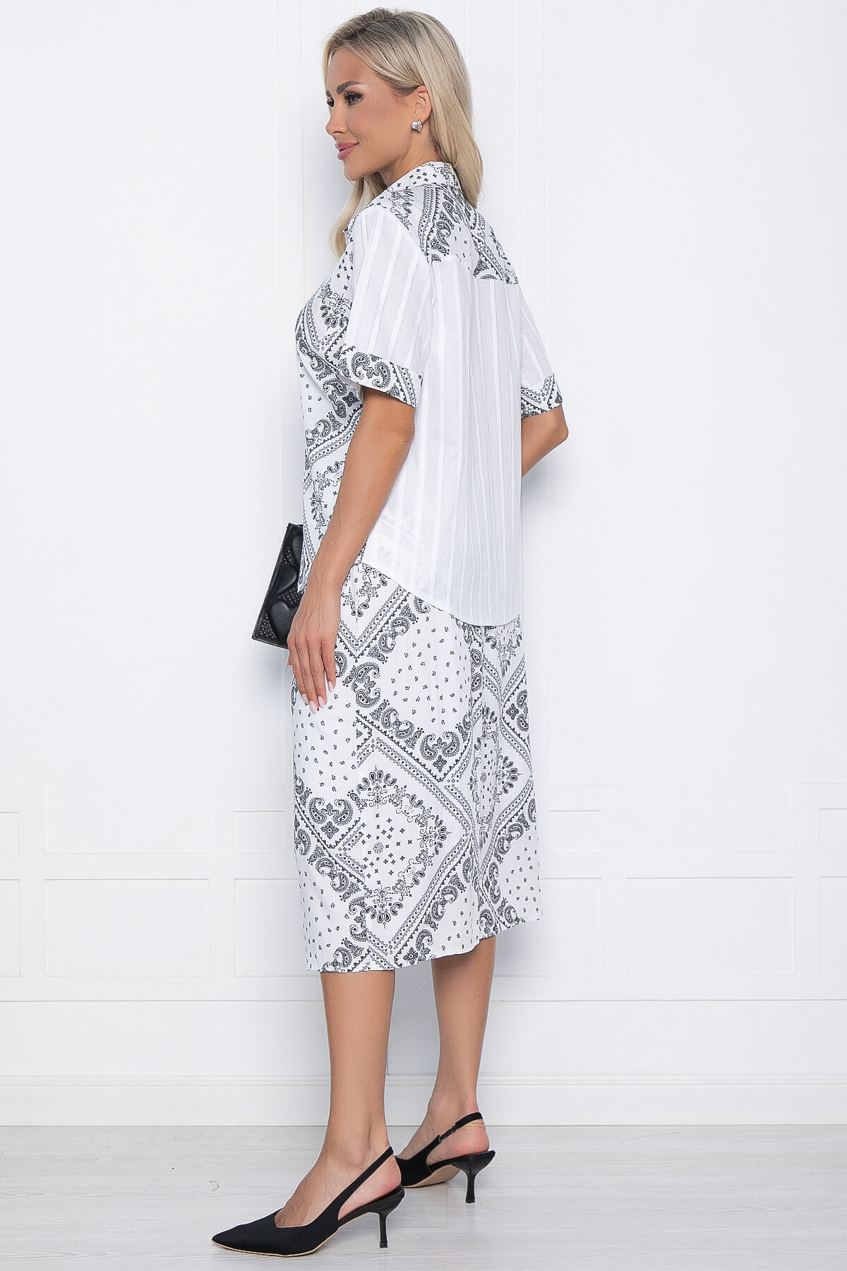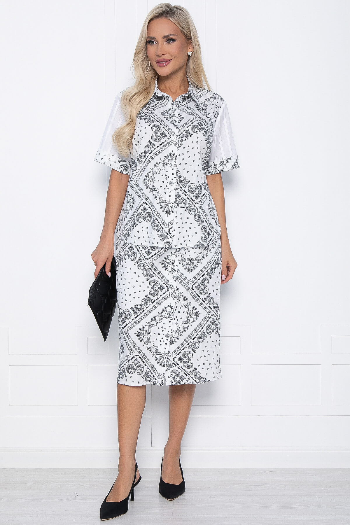 Представляю вашему вниманию стильный костюм свободного силуэта, который состоит из рубашки и юбки. Верх, спинка и рукава выполнены из отделочной ткани мережка, рукава с манжетом из основной ткани, воротник рубашечный. Этот костюм идеально подойдет как для офиса, так и для повседневной носки, создавая стильный и элегантный образ. Юбка с кокеткой, на подкладке. Застёгивается по переду на пуговицы. Юбка на пуговицах, что без проблем можно подогнать на любой, не соответствующий стандарту размер.