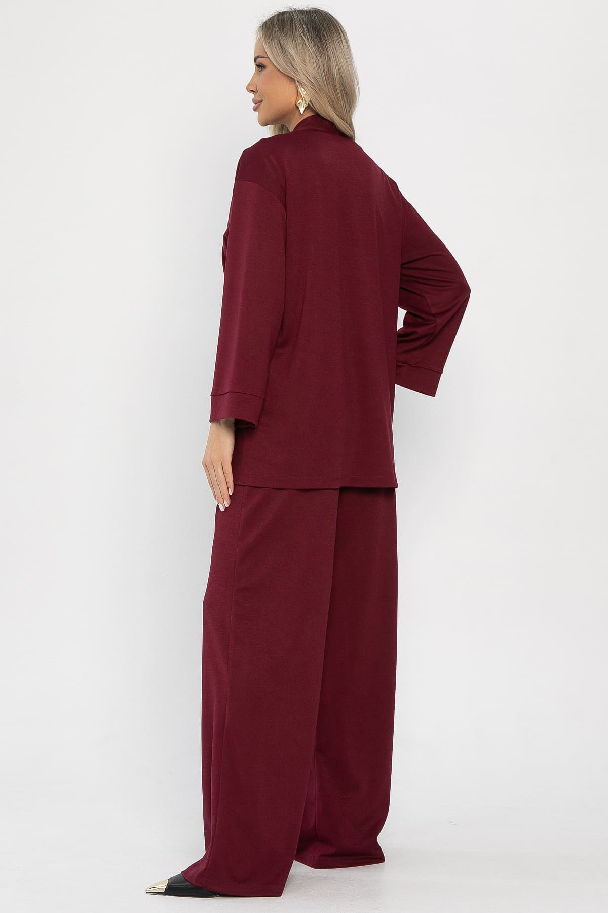 Женский брючный костюм в бордовом цвете — это превосходный выбор для тех, кто стремится выглядеть элегантно и при этом оставаться в комфорте в любую погоду. Жакет с пуговицами и слегка приспущенными рукавами обеспечивает полную свободу движений, позволяя вам чувствовать себя уверенно и свободно. Брюки-палаццо с резинкой по талии и карманами добавляют практичности и удобства, что делает этот костюм поистине универсальным и подходящим для различных ситуаций.