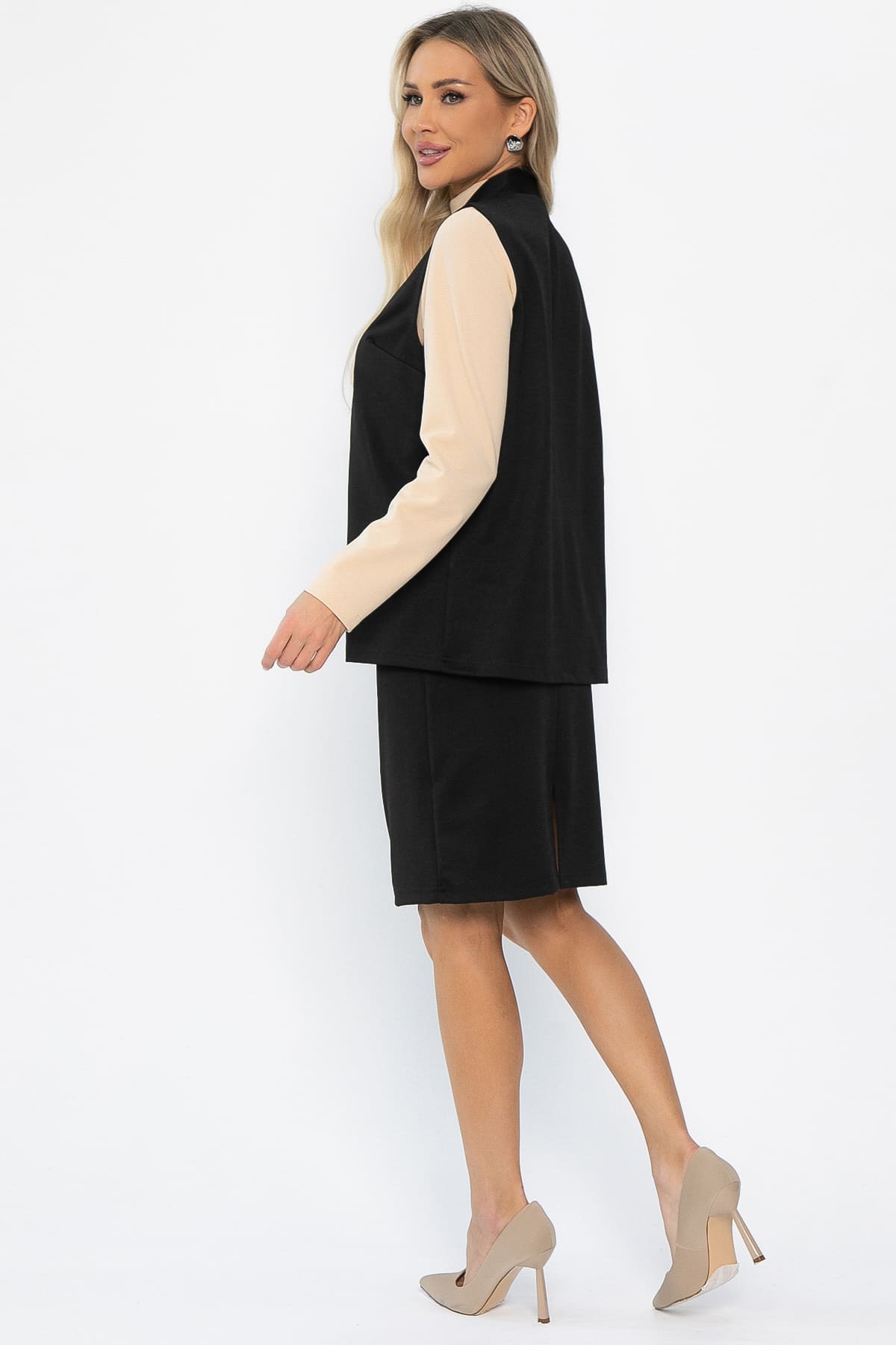 Костюм из классической юбки и жилета будет универсальным элементом вашего гардероба. Жилет с планкой по борту и с поясом. Юбка прямая, средней длины, с застёжкой на молнию, сзади разрез. Костюм подходит для ежедневной носки, а также может быть использован в офисной обстановке.