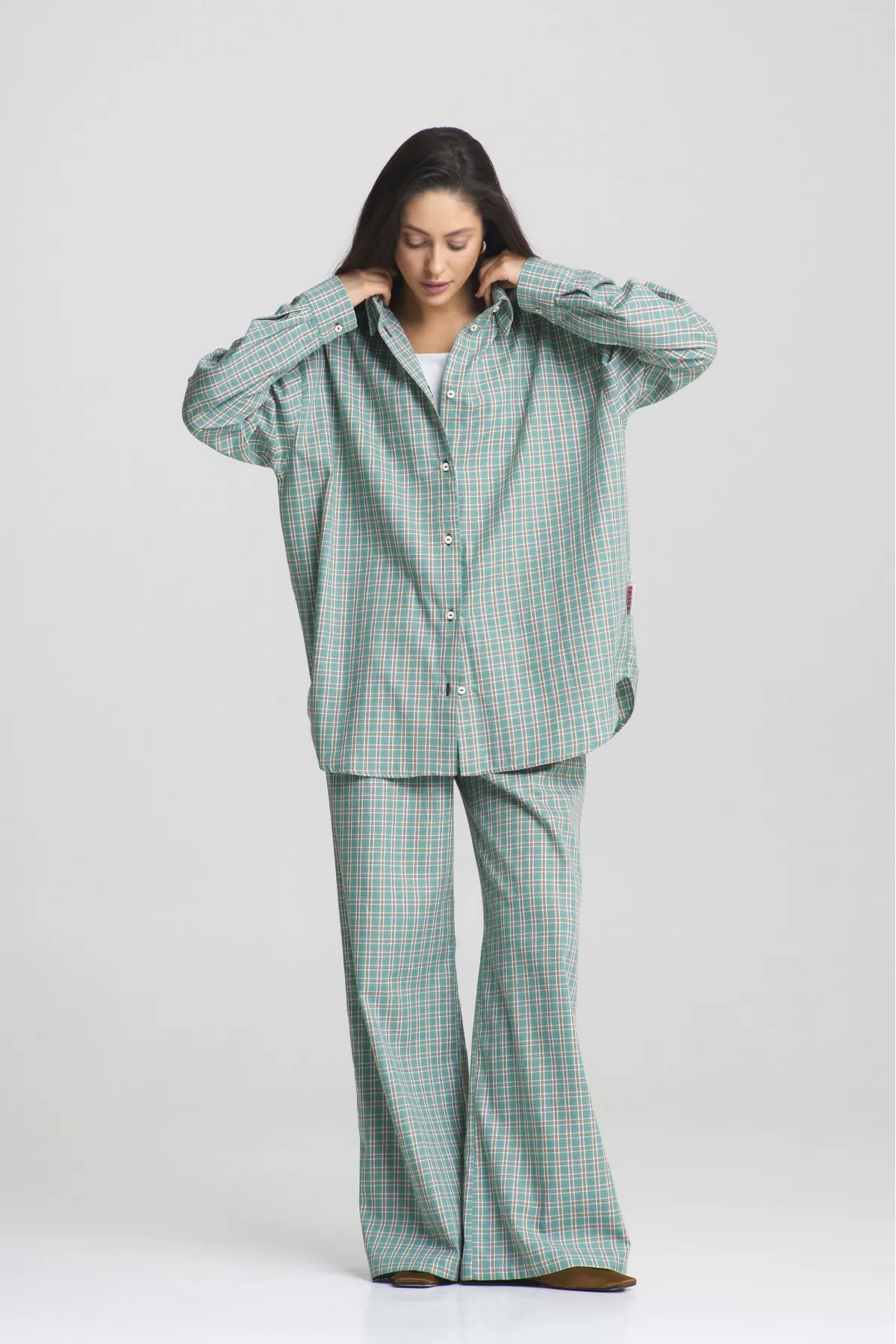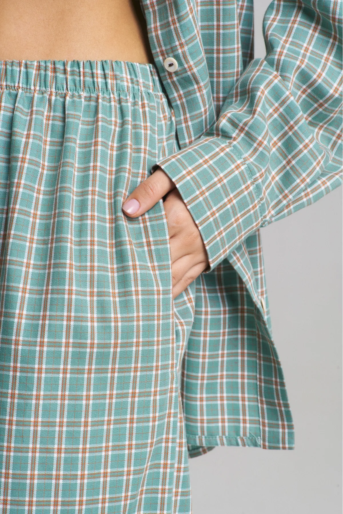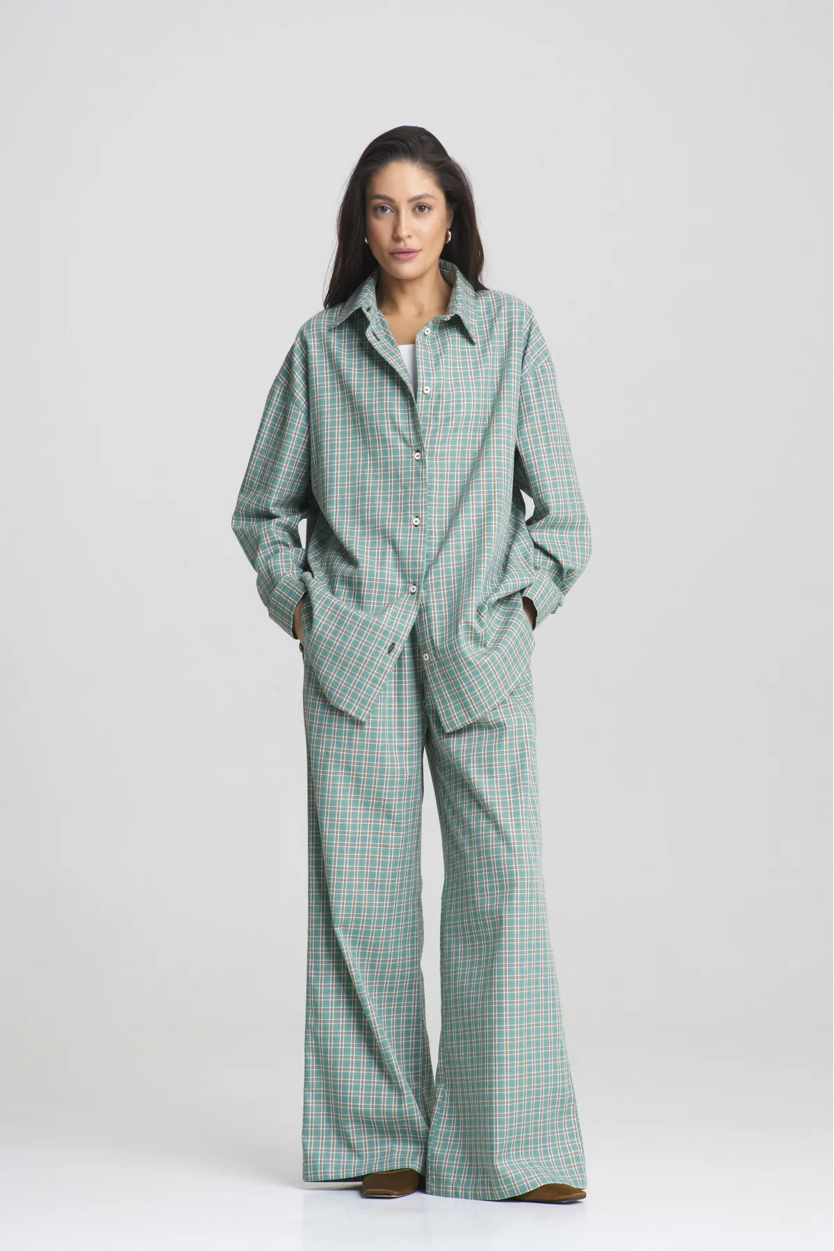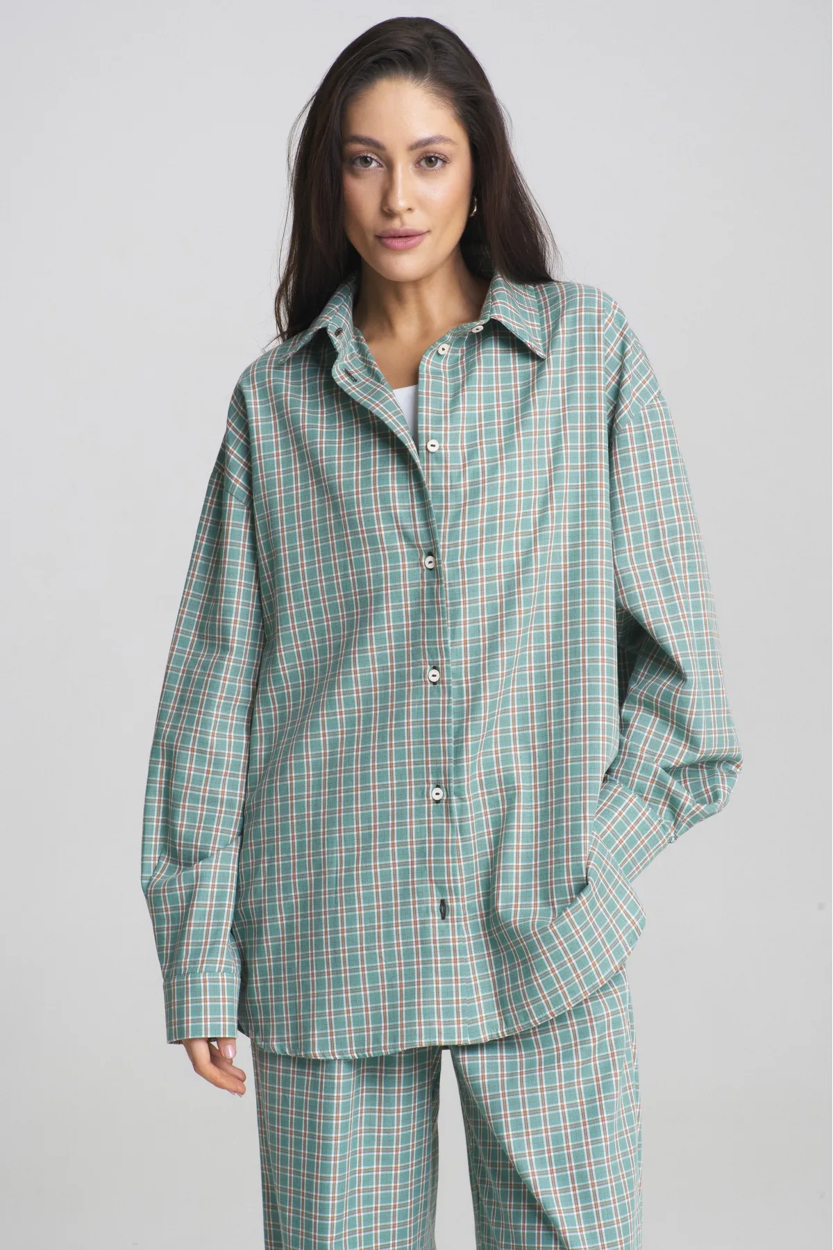 Костюм Summer в клетку — это свежий взгляд на лёгкий хлопковый гардероб: свободная классическая рубашка оверсайз с кокеткой и аккуратной складкой на спинке придаёт образу объём и ощущение пространства, а манжеты на пуговицах легко расстегнуть для более расслабленного настроения или застегнуть при необходимости. Широкие брюки на мягкой резинке скарманами становятся достойной альтернативой привычным моделям с полоской, объединяя комфорт и аккуратный силуэт.