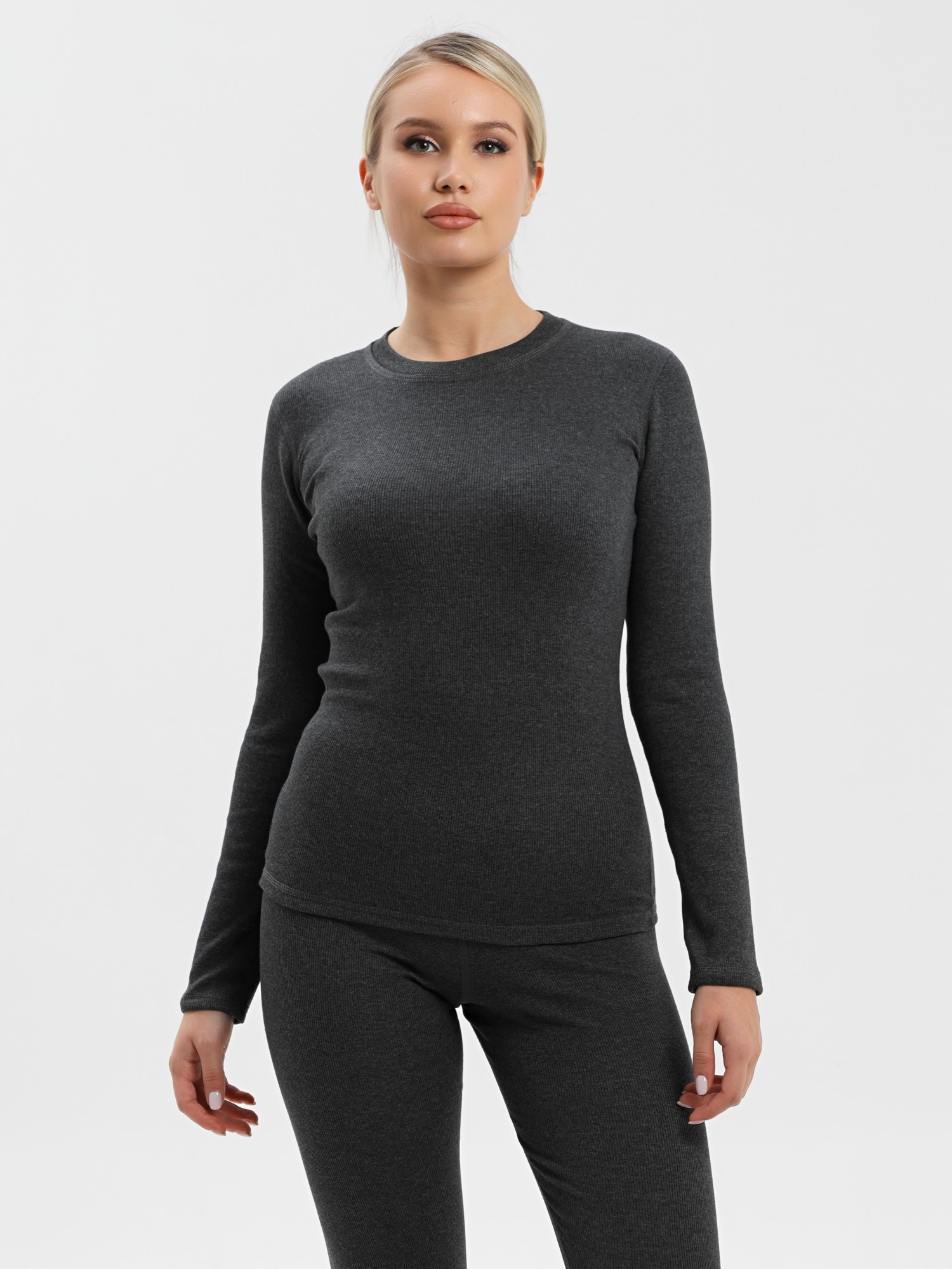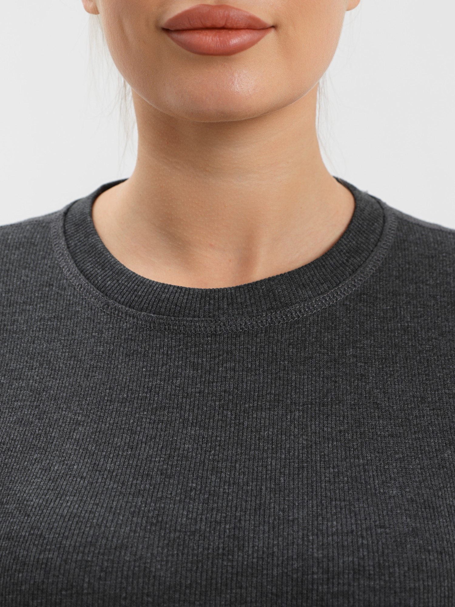 Футболка – прилегающего силуэта, с длинными втачными рукавами, горловиной овальной формы, обработанной втачной планкой из основного материала. Подгибка низа изделия и рукавов, шва втачивания планки в горловину обработаны пяти ниточной строчкой в цвет основного материала.