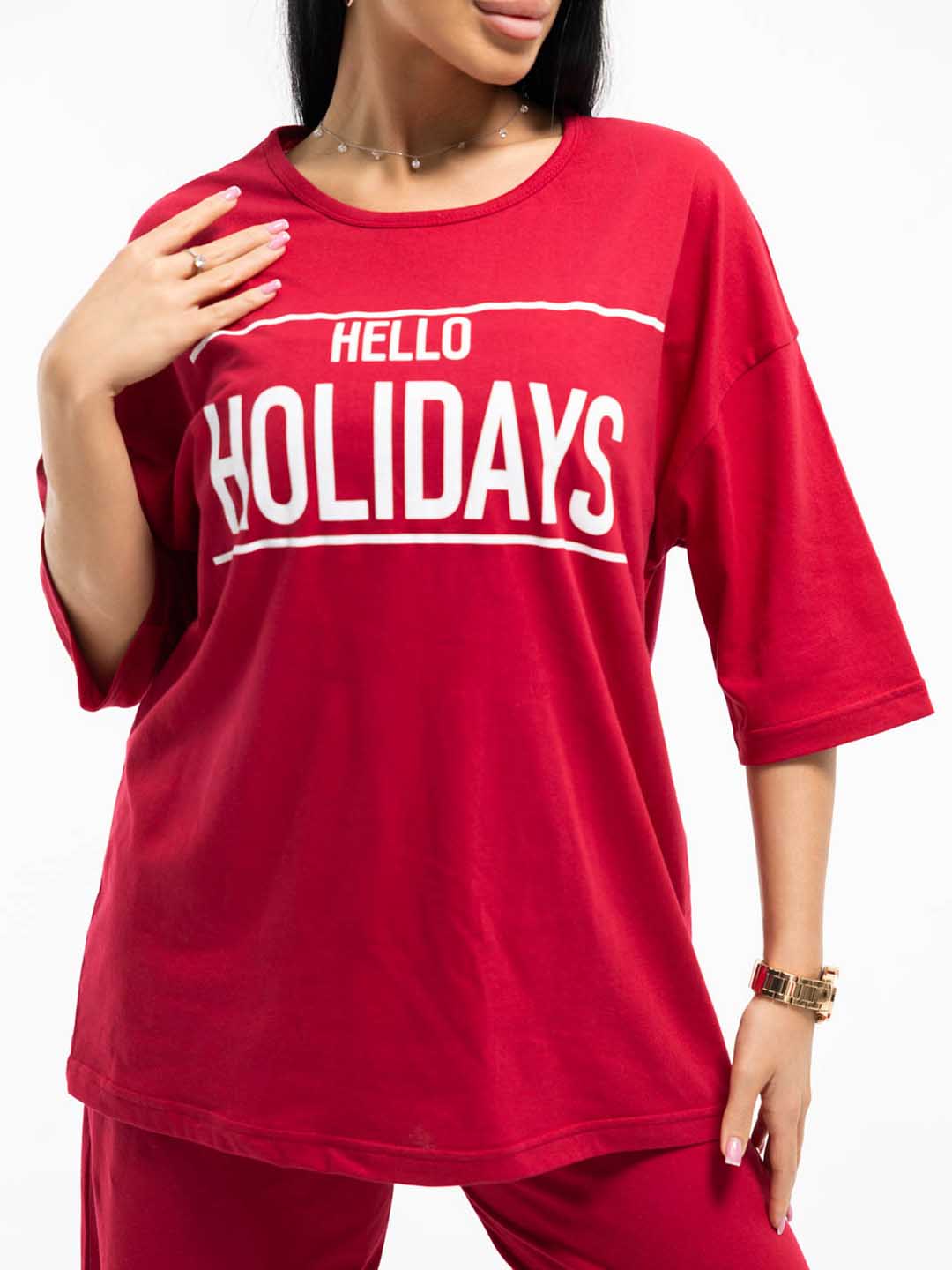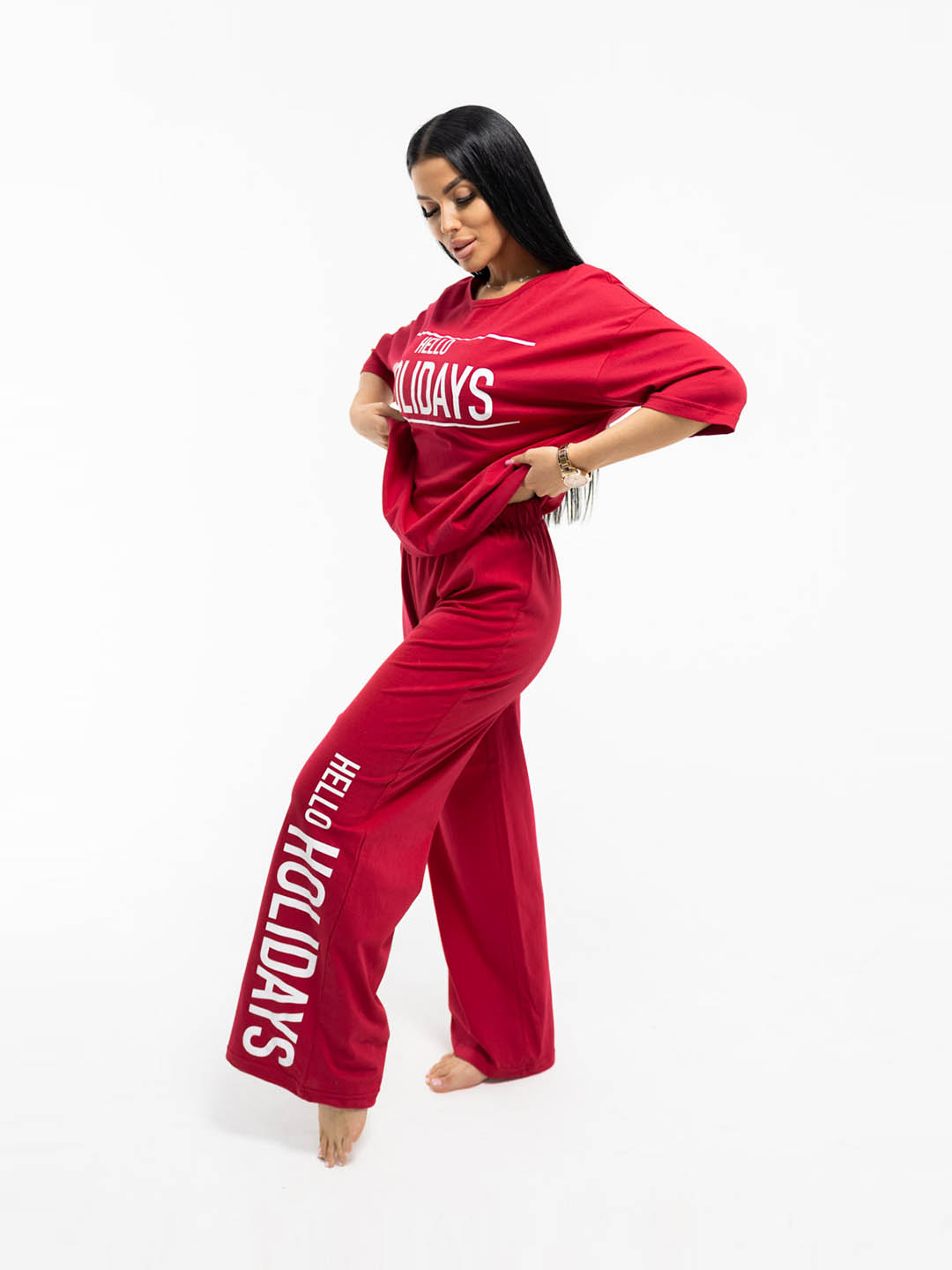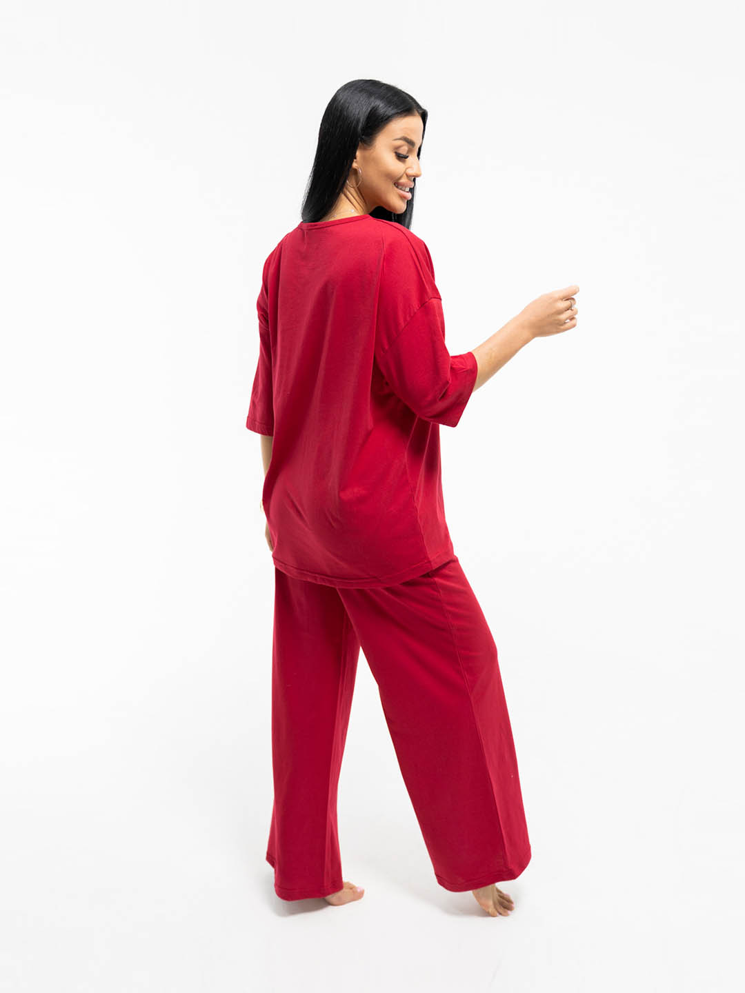 Женский костюм цвета бордо — идеальное сочетание стиля и комфорта для дома. Изготовленный из мягкого трикотажа, он обеспечит вам ощущение невероятного уюта в любое время дня. Футболка с длинным рукавом и брюки с эластичным поясом создают элегантный образ. Почувствуйте себя стильно в этом шикарном домашнем костюме!