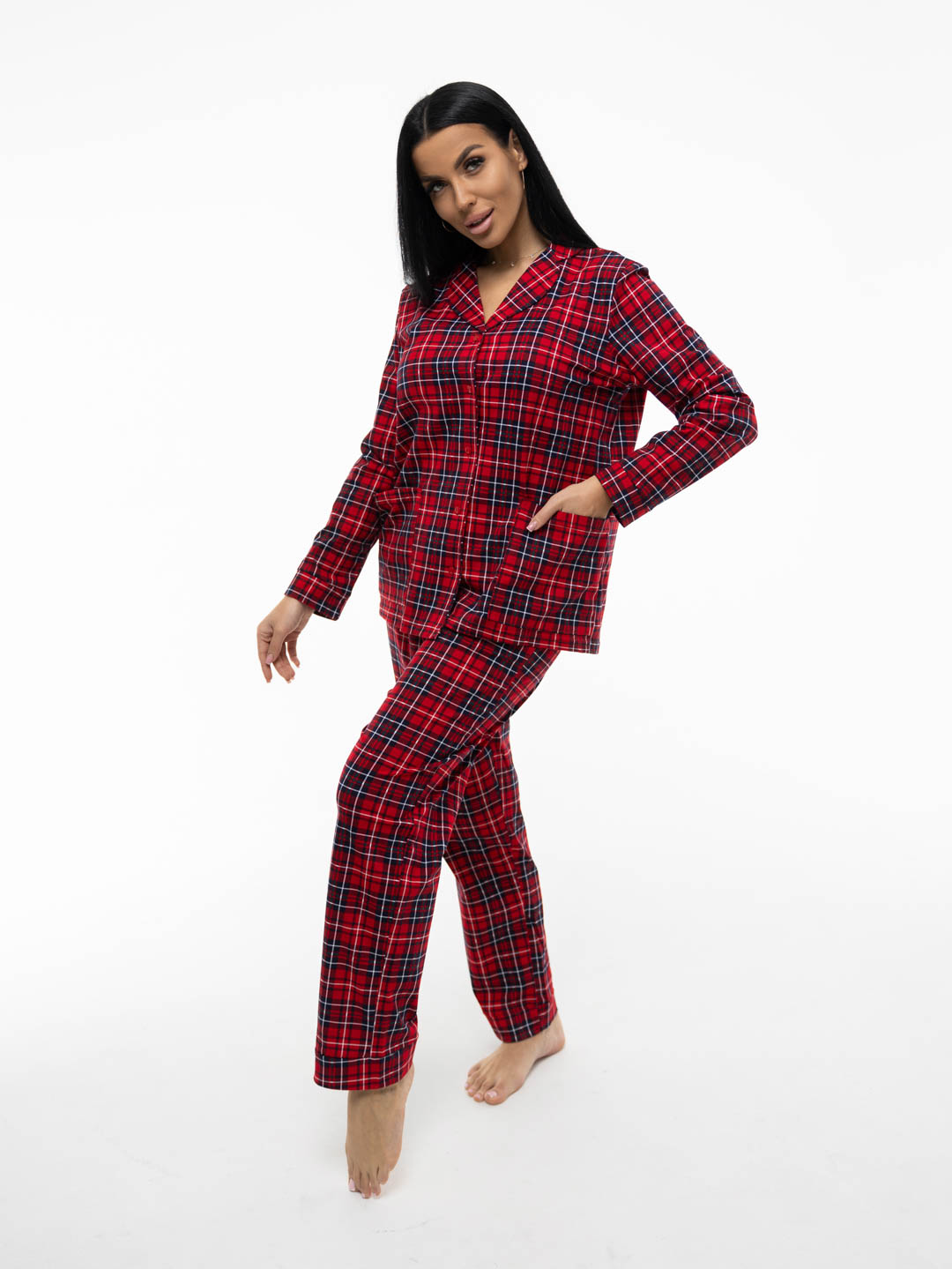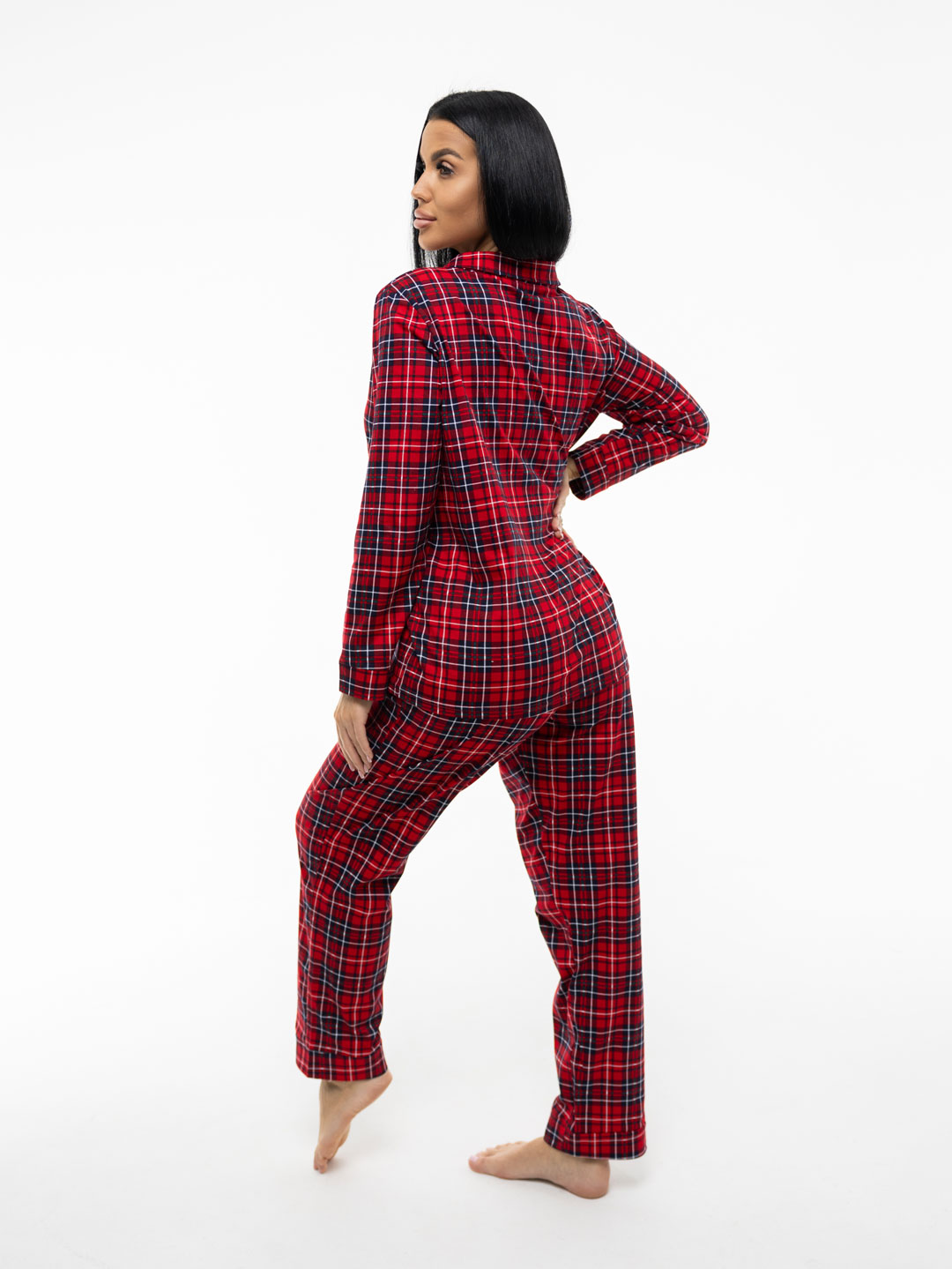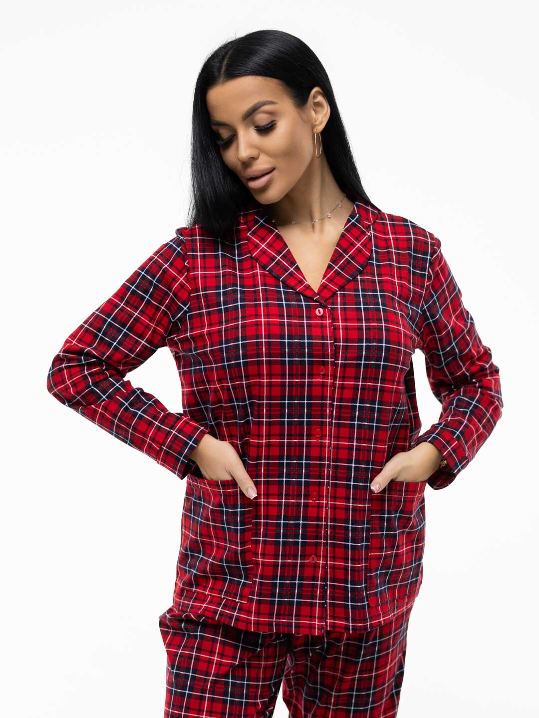 Красная пижама в клеточку с длинным рукавом станет незаменимой вещью в гардеробе любой девушки. Верх пижамы с отложным воротником, базовым втачным рукавом и двумя накладными карманами на полочке. Брюки умеренного объема на резинке. Наш костюм идеально подойдет для пижамной вечеринки с подружками, фотосессии или просто на каждый день.