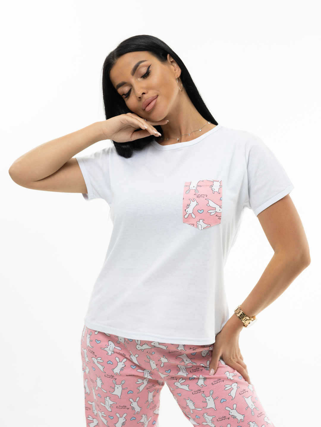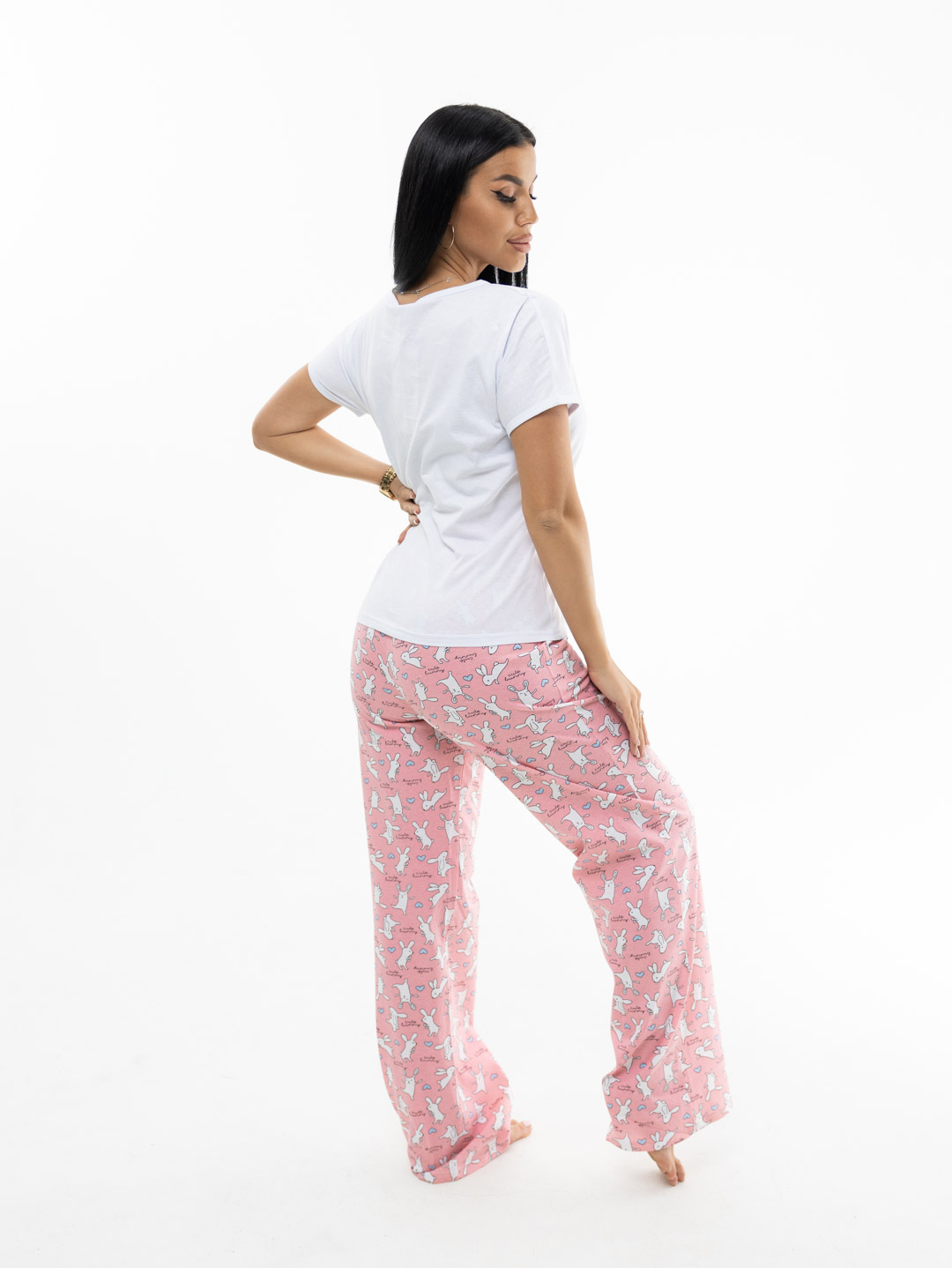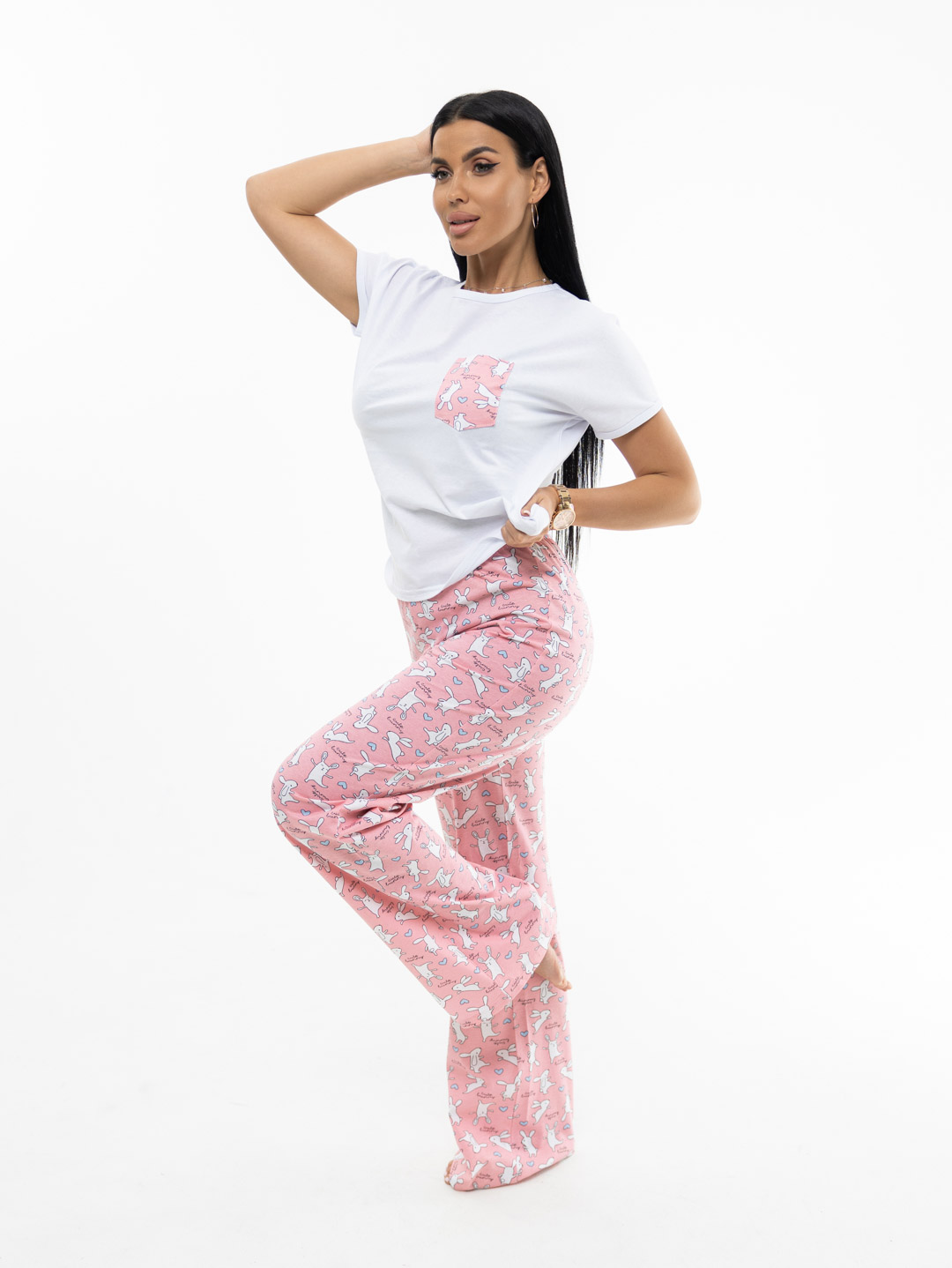 Женский костюм с брюками из 100% хлопка. Футболка со спущенной линией плеча, О-образной горловиной и накладным карманом на полочке. Широкие брюки из набивной кулирки с атласным бантом.