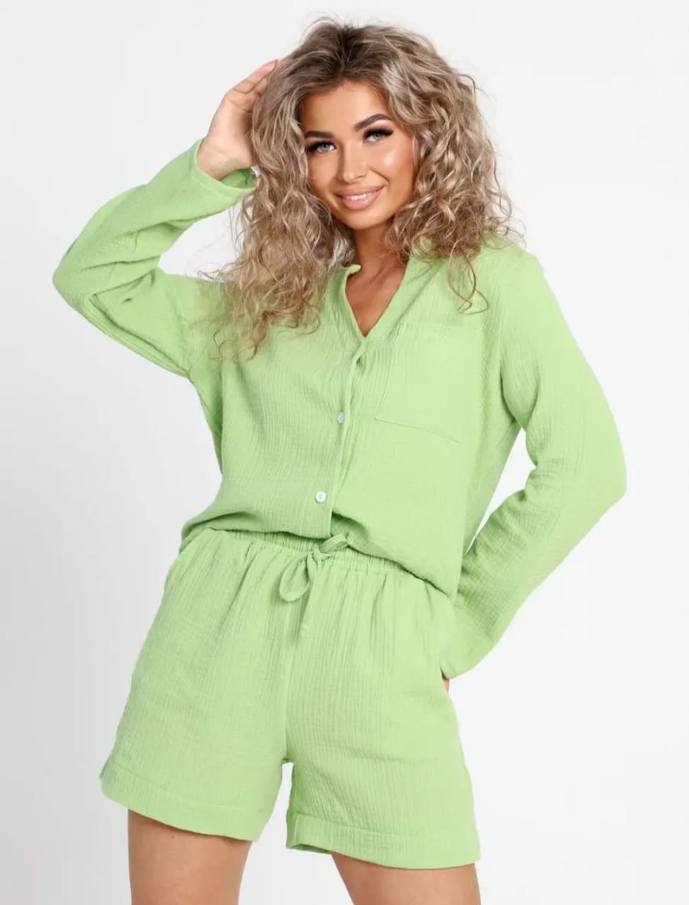 Костюм рубашка с шортами изготовлен из муслина, 100% хлопок. Органические краски, устойчивые к стиркам. Не образует катышки. Женская одежда из муслина высокопрочная, износостойкая и воздухопроницаемая, позволяет коже дышать, в ней не жарко даже при максимальных температурах.