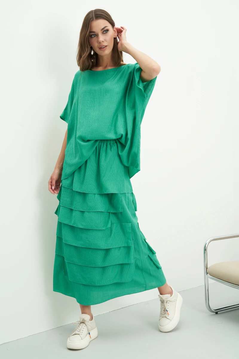 Казалось бы, лучшая одежда для тёплого лета - это платье, сшитое из лёгкой ткани, однако, по сравнению с платьем или сарафаном, комплект имеет преимущества, которые сложно оспорить. Во-первых, хорошая комбинаторность. Вы легко можете сочетать вещи комплекта с другими предметами гардероба - футболками, брюками, топами. Во-вторых, комплект умело скрывает недостатки телосложения, при этом подчёркивает женственность, являясь более практичной одеждой. Комплект состоит из свободной бузы и юбки. Блуза с расширенной линией горловины цельнокроенного покроя с коротким рукавом, широкая по форме с прямой линией низа. Юбка на широком притачном поясе с удобной эластичной лентой внутри и застёжкой на потайную тесьму - молнию сбоку. И поскольку многослойность сейчас в тренде - переднее с заднее полотнище юбки выполнено в виде настрочных асимметричных воланов без сборки - что даёт нужный правильный эффект без оптического увеличения объёмов. Комплект дополнен широким мягким поясом, который по Вашему желанию подчеркнёт линию талии. Длина блузы по спинке около 56 см, длина юбки около 89 см.