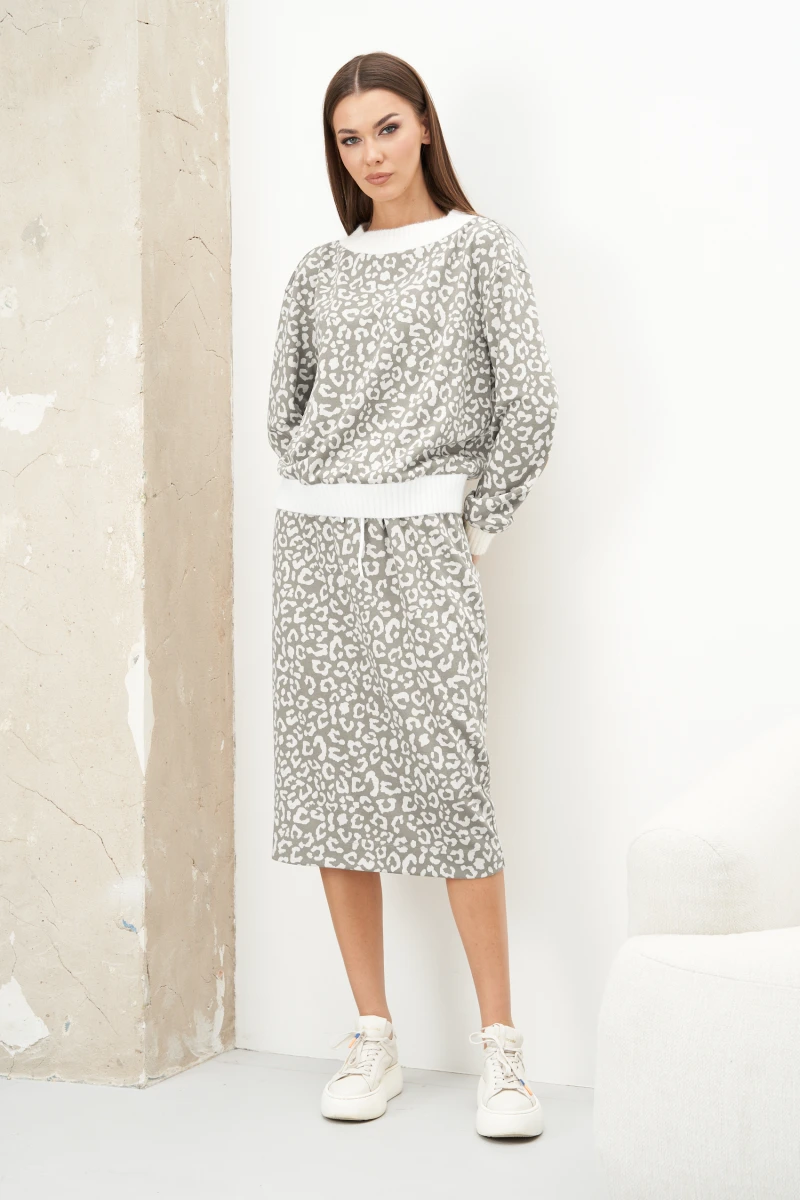 Трикотажный костюм с юбкой — это модное решение для гардероба в стиле кэжуал.Городской темп жизни диктует нам определённые модные правила ультраудобный комплект из мягкого полотна с актуальным в осенне-зимнем сезоне принтом-беспроигрышный вариант.Свободный комфортный джемпер с мягкой линией плеча интересно обыгран при помощи мягких ангоровых довязов.Юбка прямая, на приточном эластичном поясе с отделочным шнуром. По заднему полотнищу юбки вытачки, средний шов и подрез.Длина жакета 68см.Длина рукава с плечом около 72 см.Длина юбки около 68 см.