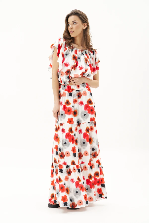 Летний сезон - это всегда романтика, приключения, игривое настроение и мир моды погружает нас в это состояние, радуя очередными новинками.Невероятно комфортный, лёгкий вискозный комплект с юбкой и блузой.Юбка А-образного силуэта, состоит из трёх горизонтальных воланов с лёгкой сборкой и на эластичном поясе.Блуза свободная с вертикальными рельефами, рукавом- крылышко, эластичными буфами по линии горловины и эластичной тесьмой по низу.Длина юбки около 90 см. Длина блузы около 52 см.Длина рукава около 15 см.
