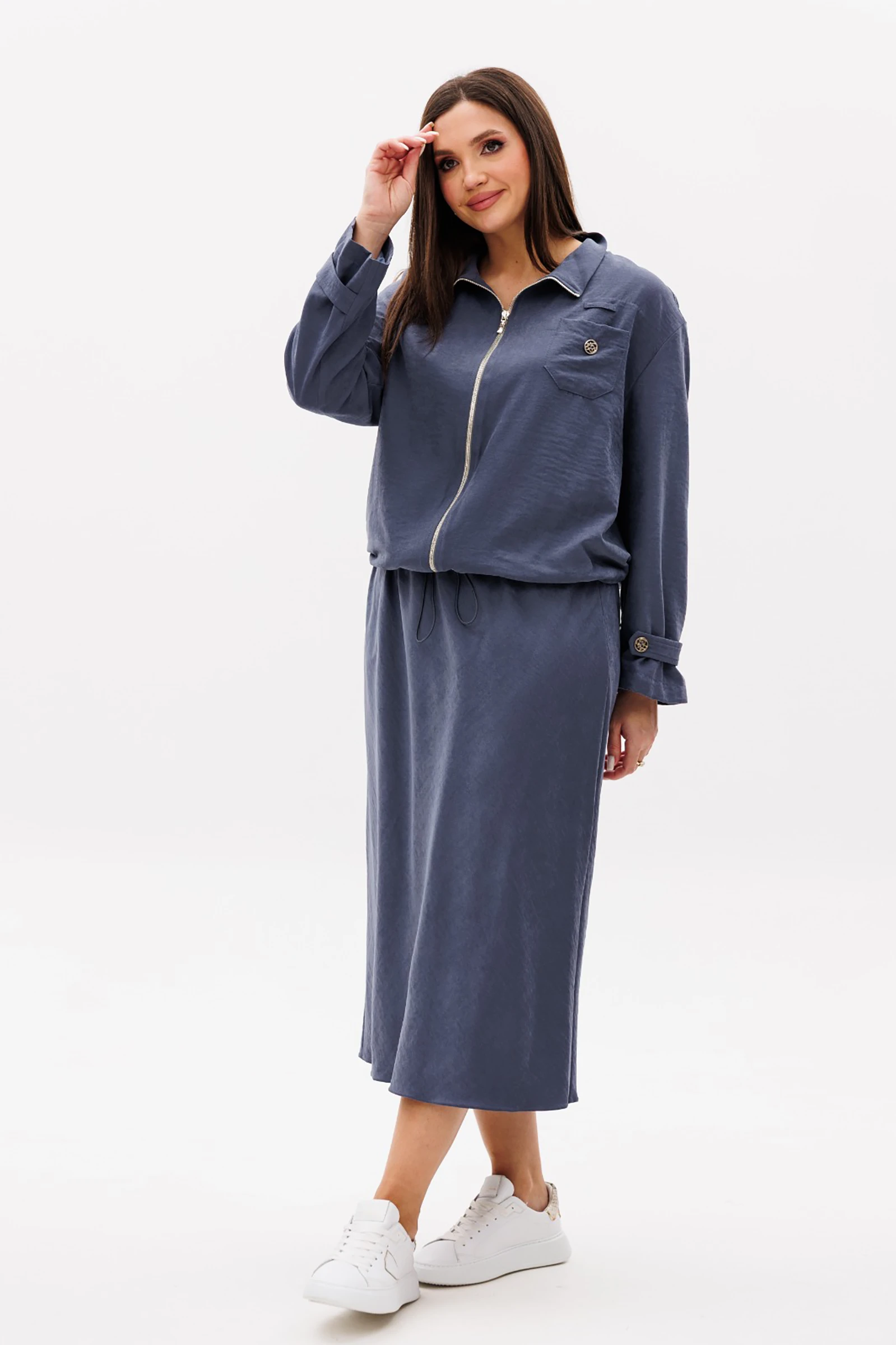 Этот вариант комплекта практически универсален, поскольку одинаково хорошо подойдет и молодым девушкам и леди элегантного возраста. Для тех, кто ищет комфортную повседневную одежду, интересную и привлекательную, модель просто идеальна. Свободная куртка на подкладке и юбка, косого кроя, из невероятного полотна с эффектом "бархатистости" или в народе "мокрым эффектом". Куртка свободного силуэта, рубашечного покроя с воротником-стойкой и центральной застежкой на тесьму-молнию. Полочка с накладным карманом в области груди. Рукав с патой на пуговице в нижней части. По низу куртки-кулиса, с эластичной тесьмой и фиксаторами. Юбка на подкладке, косого кроя, с застежкой по боковому шву на потайную молнию и пуговицу и эластичным притачным поясом.