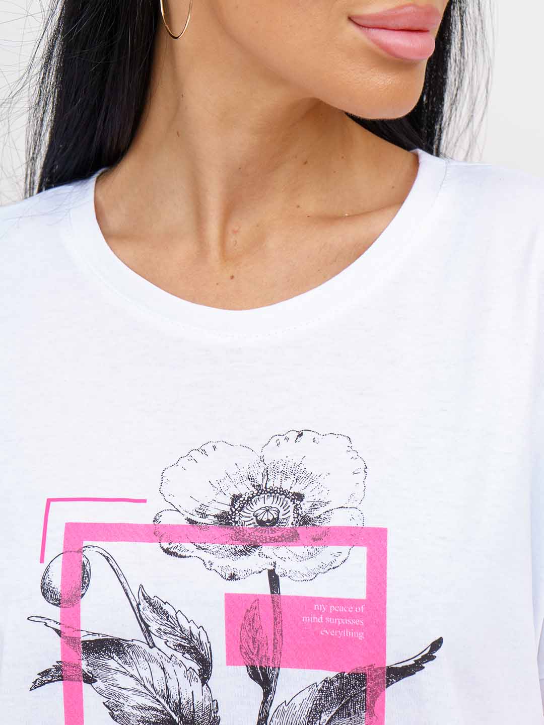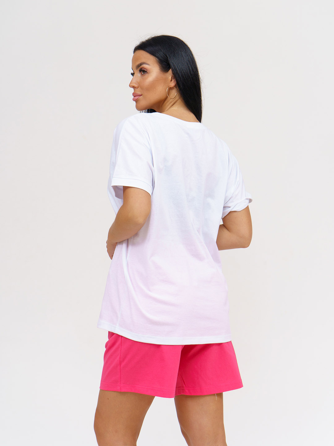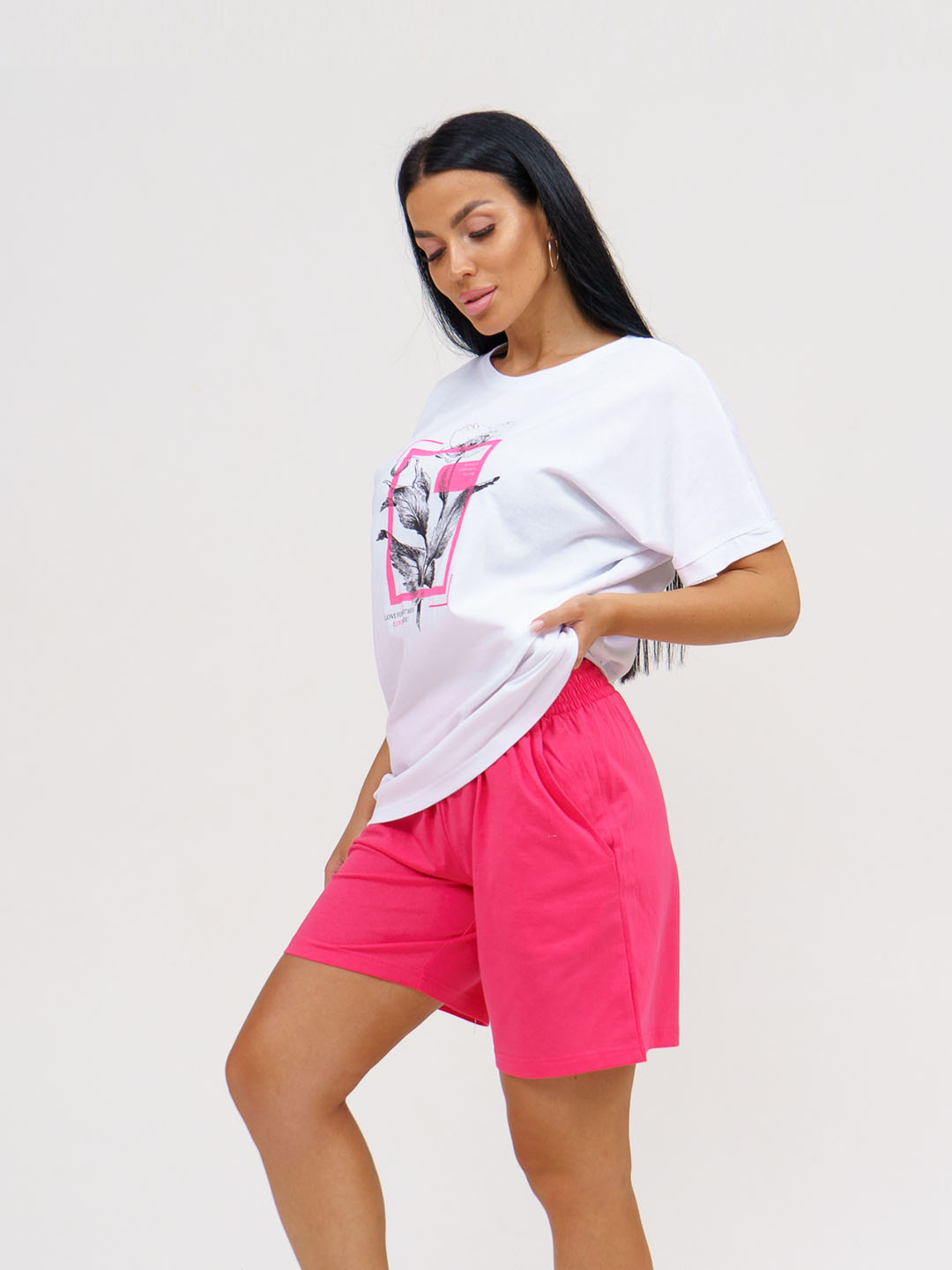 Сочный и стильный летний образ ждет тебя! Хлопковый трикотажный костюм включает в себя яркие розовые шорты и уютную белую футболку с интересным принтом на груди. Комфорт и модный вид гарантированы! Идеальный выбор для пляжа, прогулок по городу или вечерних посиделок с друзьями. Будь в тренде с этим стильным комплектом!