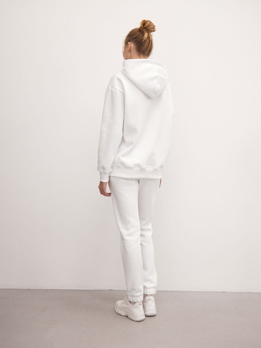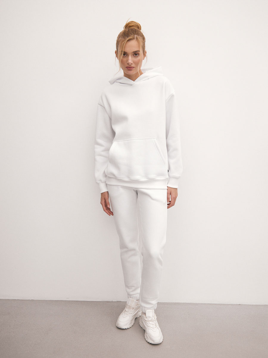 Женский костюм из футера с начесом толстовка и джоггеры. Толстовка с втачными рукавами и капюшоном. В толстовке манжеты и пояс из кашкорсе в цвет футера. На полочке накладной карман-кенгуру. Брюки с боковыми карманами, с цельнокроеным поясом, строчёным с эластичной тесьмой и манжетами с эластичной тесьмой. В пояс брюк вставлен шнур. Подкладка: 95% хлопок/ 5% эластан
