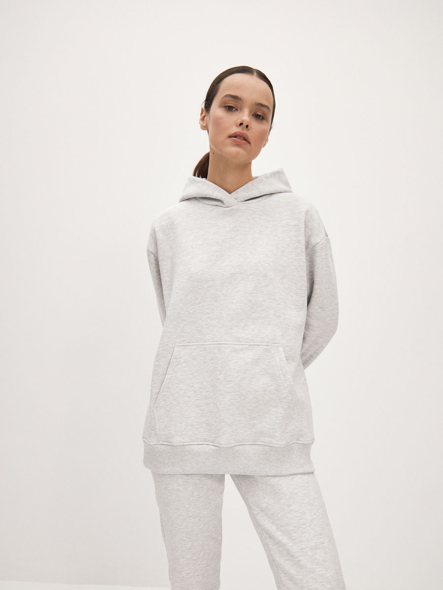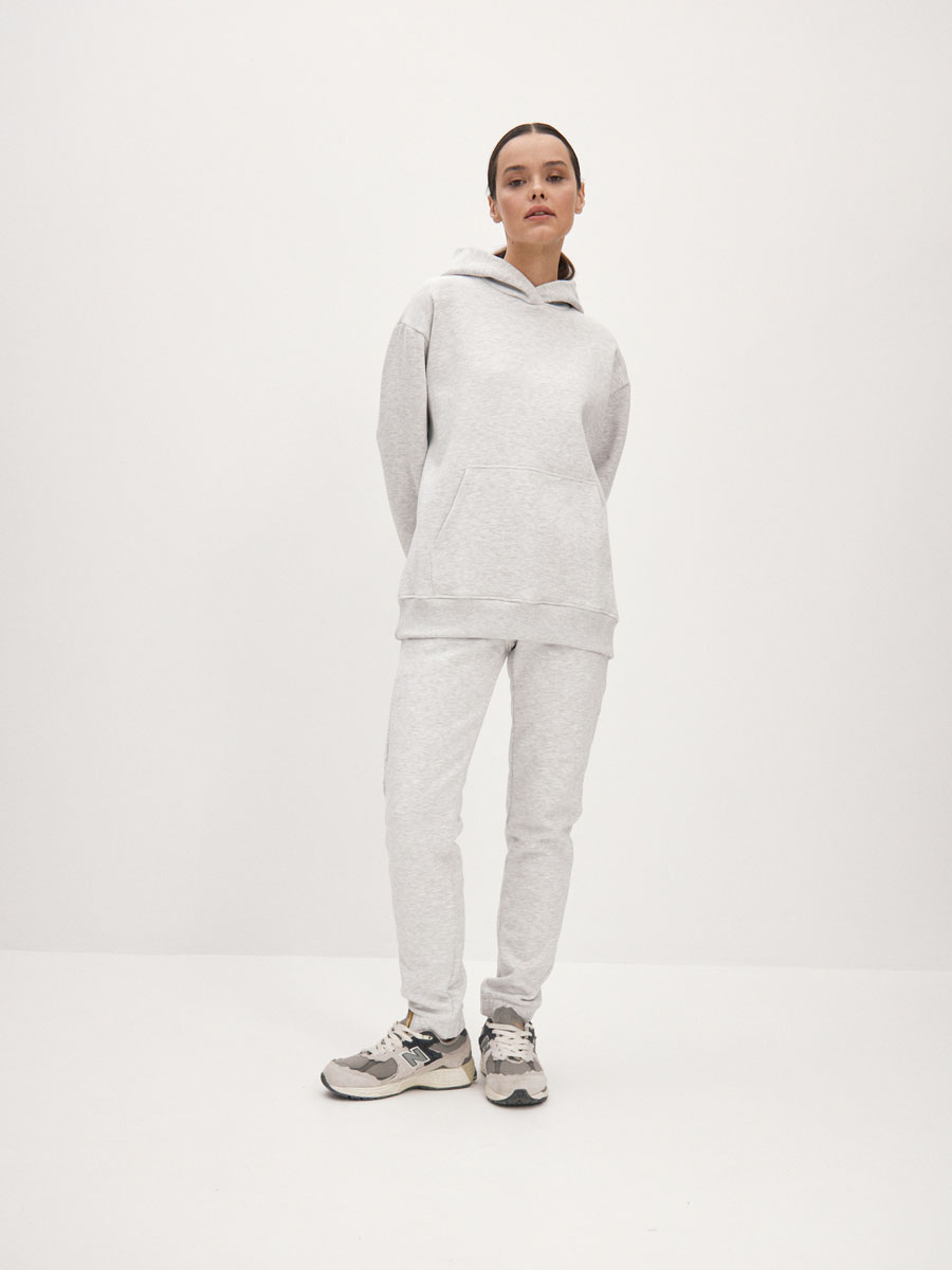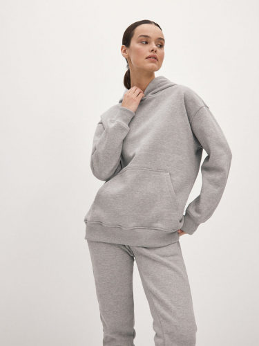 Женский костюм из футера с начесом толстовка и джоггеры. Толстовка с втачными рукавами и капюшоном. В толстовке манжеты и пояс из кашкорсе в цвет футера. На полочке накладной карман-кенгуру. Брюки с боковыми карманами, с цельнокроеным поясом, строчёным с эластичной тесьмой и манжетами с эластичной тесьмой. В пояс брюк вставлен шнур. Подкладка: 95% хлопок/ 5% эластан