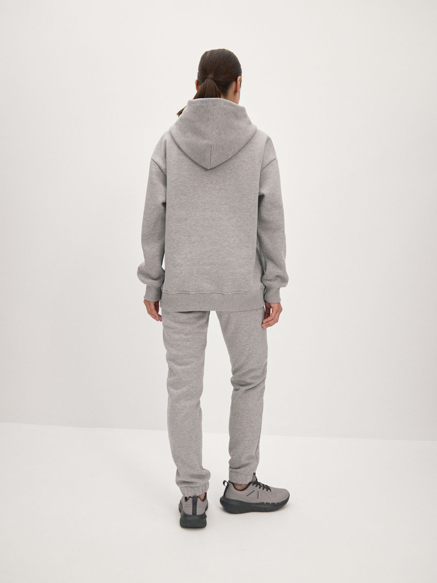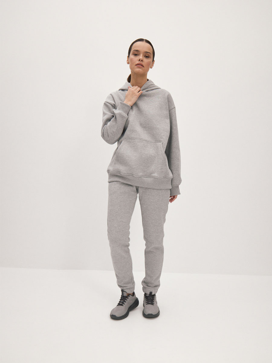 Женский костюм из футера с начесом толстовка и джоггеры. Толстовка с втачными рукавами и капюшоном. В толстовке манжеты и пояс из кашкорсе в цвет футера. На полочке накладной карман-кенгуру. Брюки с боковыми карманами, с цельнокроеным поясом, строчёным с эластичной тесьмой и манжетами с эластичной тесьмой. В пояс брюк вставлен шнур. Подкладка: 95% хлопок/ 5% эластан