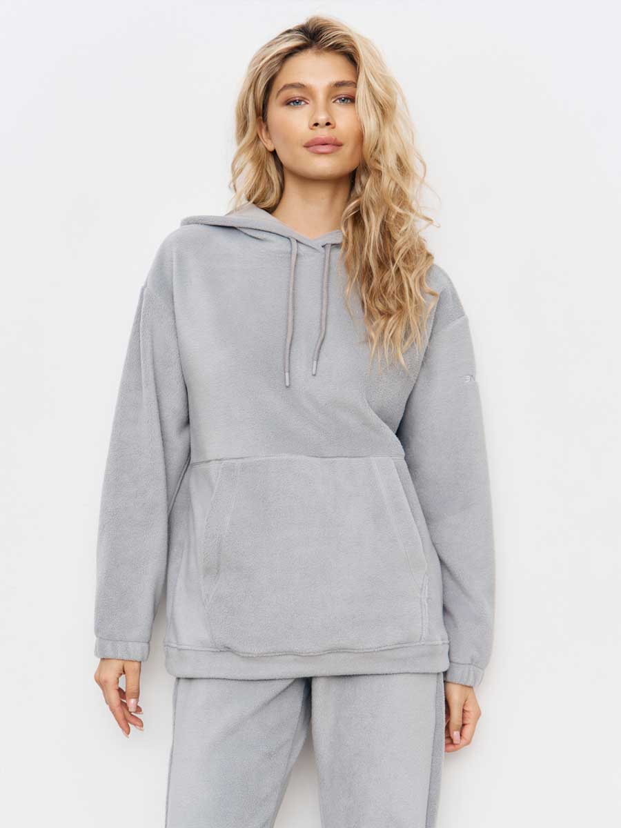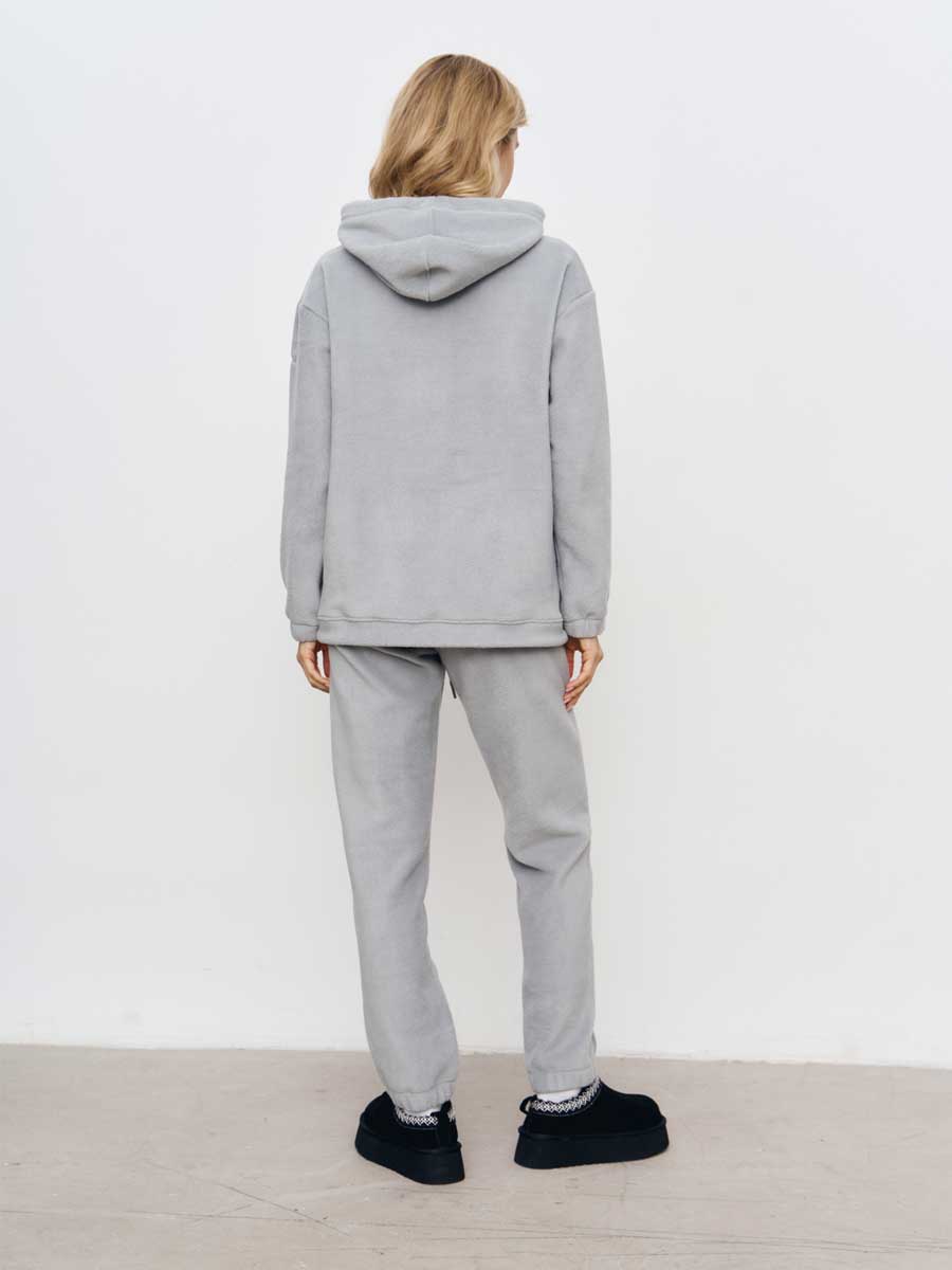 Женский костюм из футера толстовка и джоггеры. Толстовка с втачными рукавами и капюшоном, в капюшоне шнур. Низ рукава на резинке. На полочке накладной карман-кенгуру. По низу куртки пояс с резиновым шнурком для лучшего прилегания. Брюки с боковыми и задним карманами, с цельнокроеным поясом, строчёным с эластичной тесьмой и манжетами с эластичной тесьмой. В пояс брюк вставлен шнур.