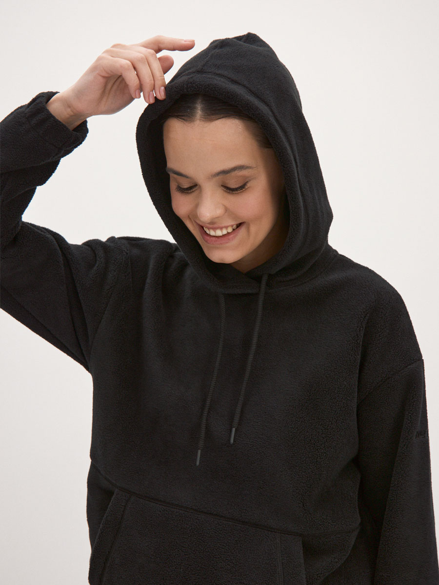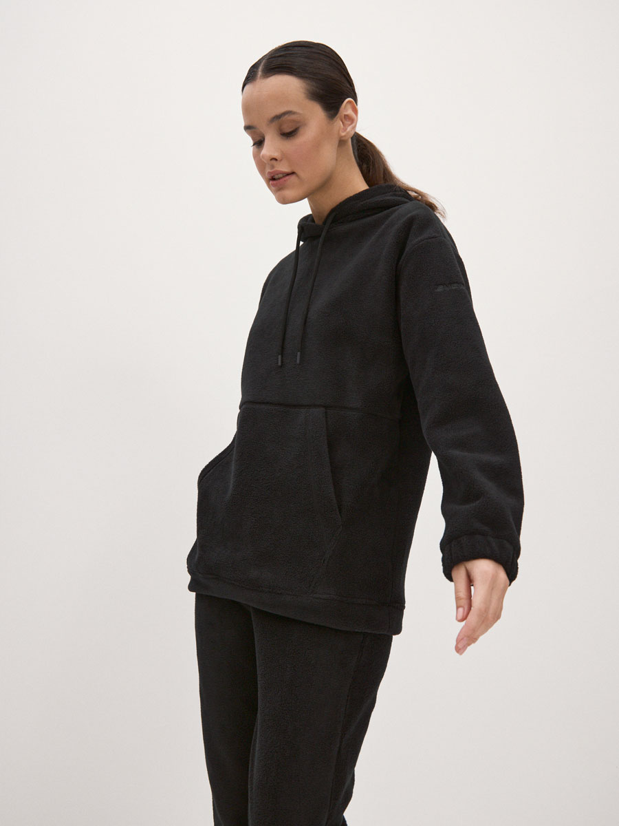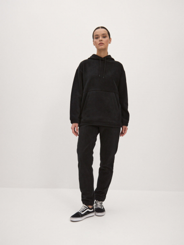 Женский костюм из футера толстовка и джоггеры. Толстовка с втачными рукавами и капюшоном, в капюшоне шнур. Низ рукава на резинке. На полочке накладной карман-кенгуру. По низу куртки пояс с резиновым шнурком для лучшего прилегания. Брюки с боковыми и задним карманами, с цельнокроеным поясом, строчёным с эластичной тесьмой и манжетами с эластичной тесьмой. В пояс брюк вставлен шнур.