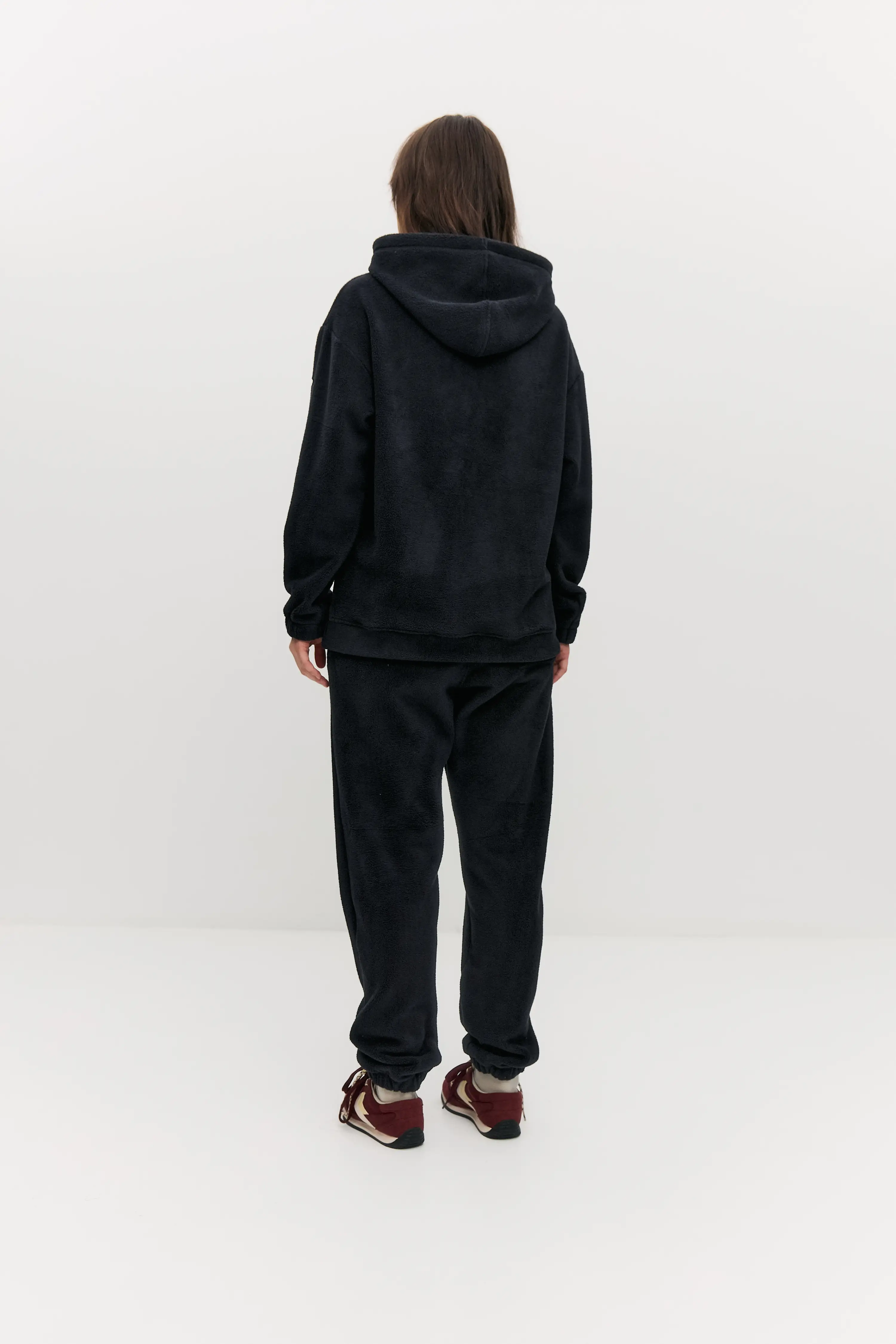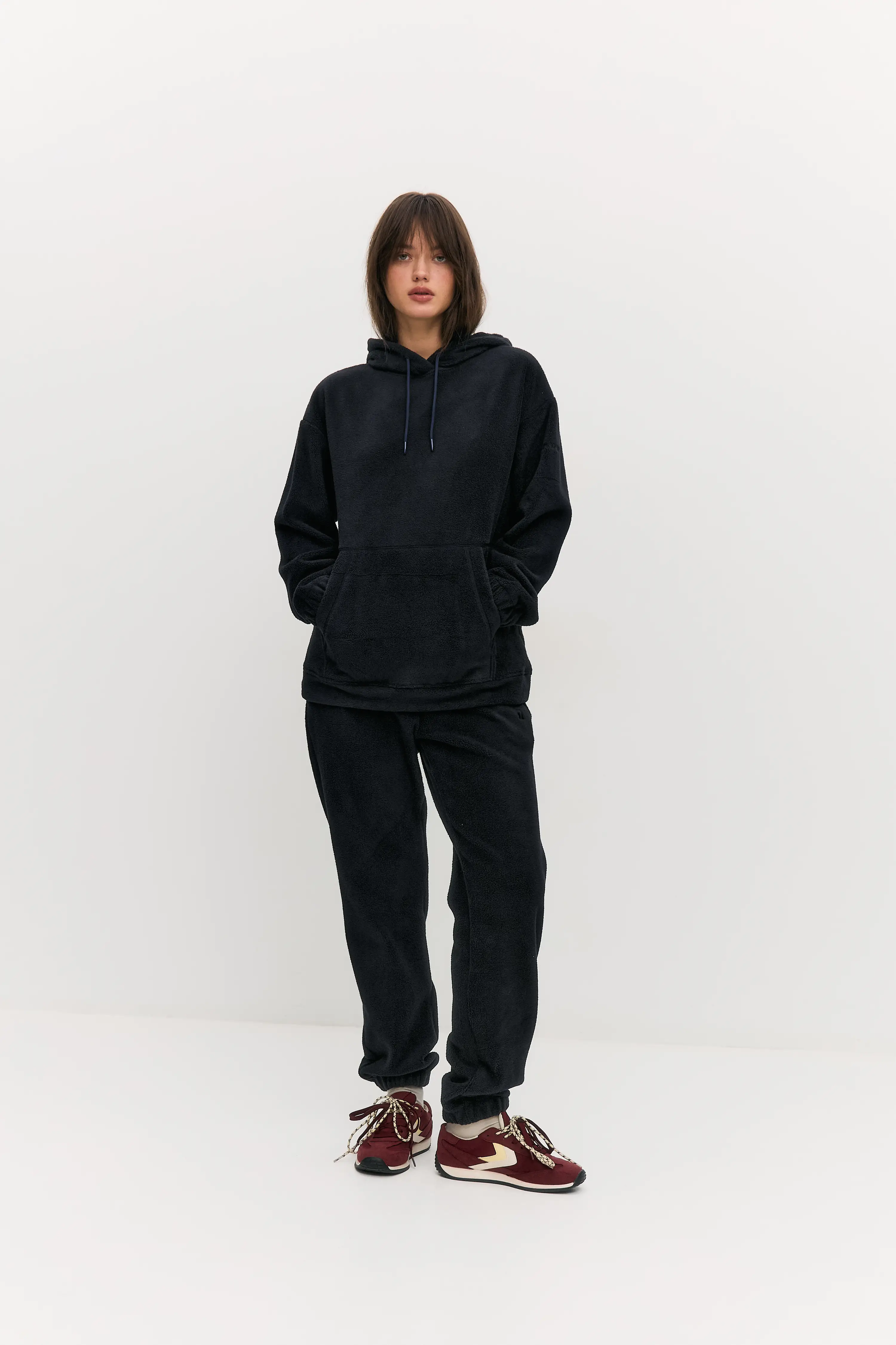 Женский костюм из футера толстовка и джоггеры. Толстовка с втачными рукавами и капюшоном, в капюшоне шнур. Низ рукава на резинке. На полочке накладной карман-кенгуру. По низу куртки пояс с резиновым шнурком для лучшего прилегания. Брюки с боковыми и задним карманами, с цельнокроеным поясом, строчёным с эластичной тесьмой и манжетами с эластичной тесьмой. В пояс брюк вставлен шнур.