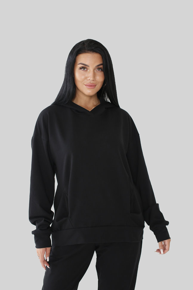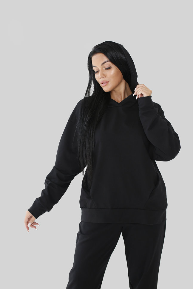 Стильный женский костюм из футера с лайкрой, цвет "Черный", толстовка с капюшоном с прорезными карманами, рукав на манжете. Брюки классические  с карманами , низ на резинке. Состав: футер 2 нитка однотонный(75% хлопок, 20% ПЭ, 5% лайкра). Размеры:50,52