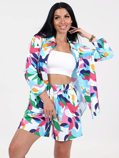 Костюм Фивея из набивного трикотажного полотна кулирка состоит из блузы-рубашки и шорт. Блуза - свободного покроя с удлиненной спинкой, с втачными рукавами длиной 7/8, отложным воротником и центральной бортовой застежкой на петли и пуговицы. Шорты - свободные, слегка расширенные книзу, средней длины, с карманами в боковых швах, на притачном поясе с эластичной лентой внутри.
