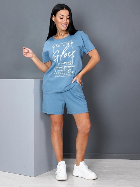 Костюм женский из футболки и шорт. На футболке двухцветная печать шелкография. Горловина округлой формы. Шорты с карманами. Боковые швы по низу шорт заканчиваются небольшими разрезами.