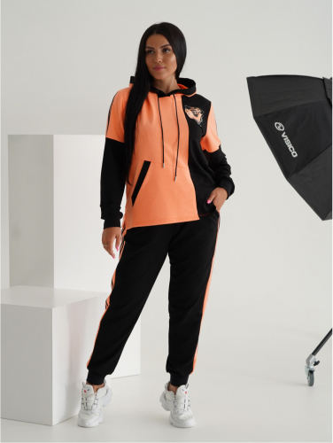 Представляем Вам наш костюм НЕОН, состоящий из кофты с длинным рукавом и брюк карманами. Кофта с капюшоном, край которого стягивает декоративный шнурок с оригинальным наконечником. Длинный рукав. Дополнением к образу служит стильная печать. Отделкой служат лампасы на части рукава и на брюках.