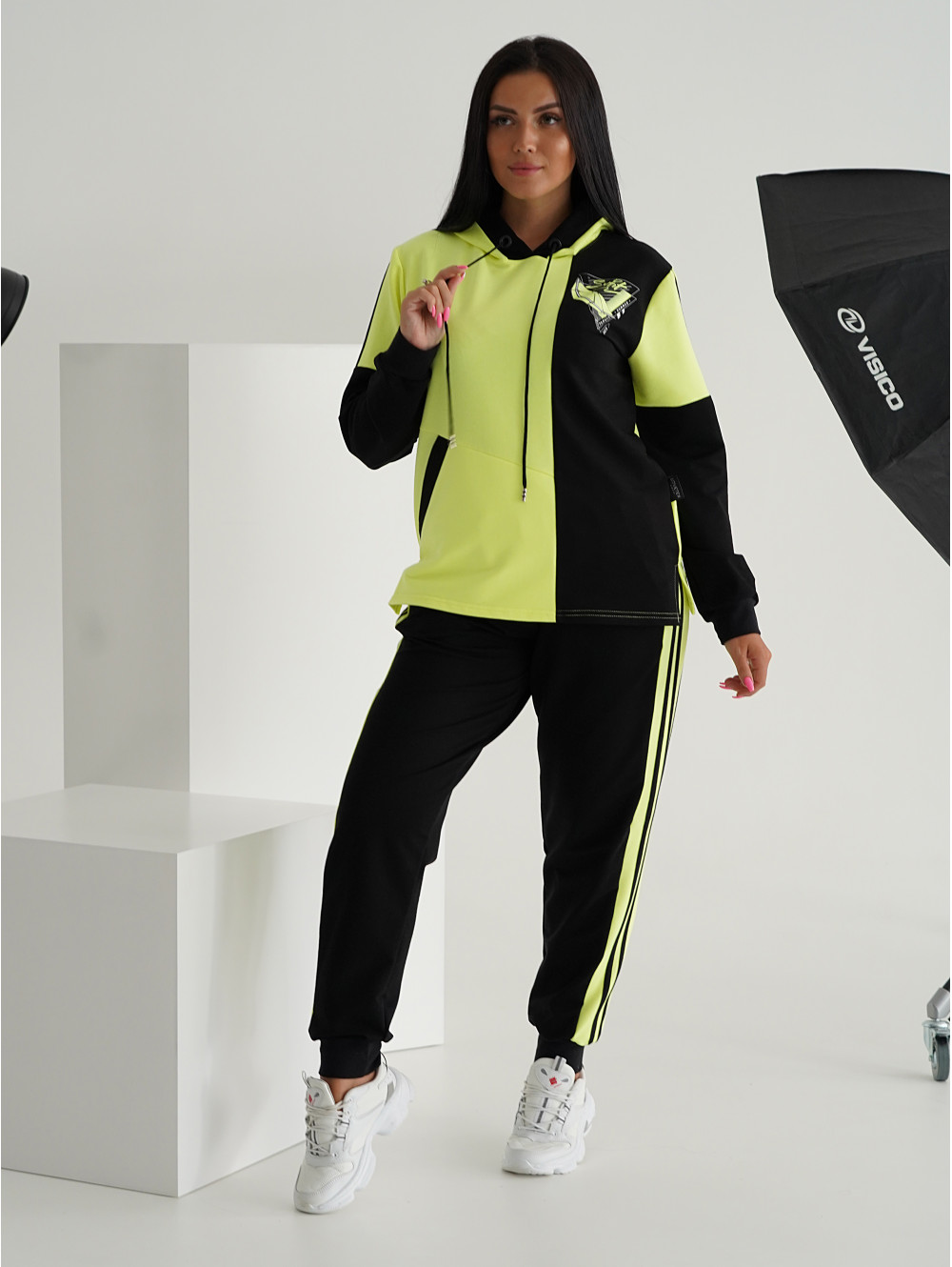 Представляем Вам наш костюм НЕОН, состоящий из кофты с длинным рукавом и брюк карманами. Кофта с капюшоном, край которого стягивает декоративный шнурок с оригинальным наконечником. Длинный рукав. Дополнением к образу служит стильная печать. Отделкой служат лампасы на части рукава и на брюках.