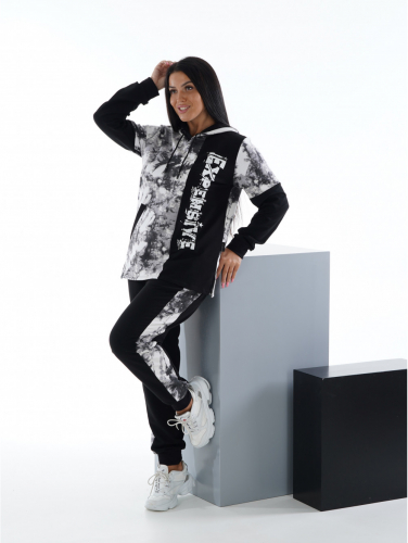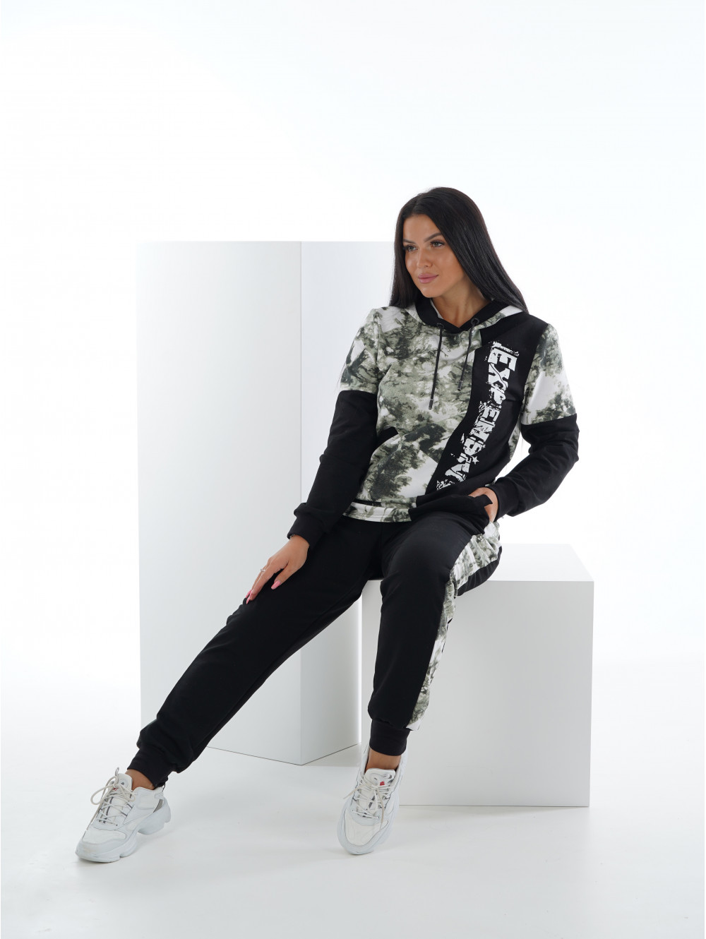 Представляем Вам наш костюм СТИХИЯ, состоящий из кофты с длинным рукавом и брюк карманами. Кофта с капюшоном, край которого стягивает декоративный шнурок с оригинальным наконечником. Длинный рукав. Дополнением к образу служит стильная печать. Отделкой служат лампасы на брюках.