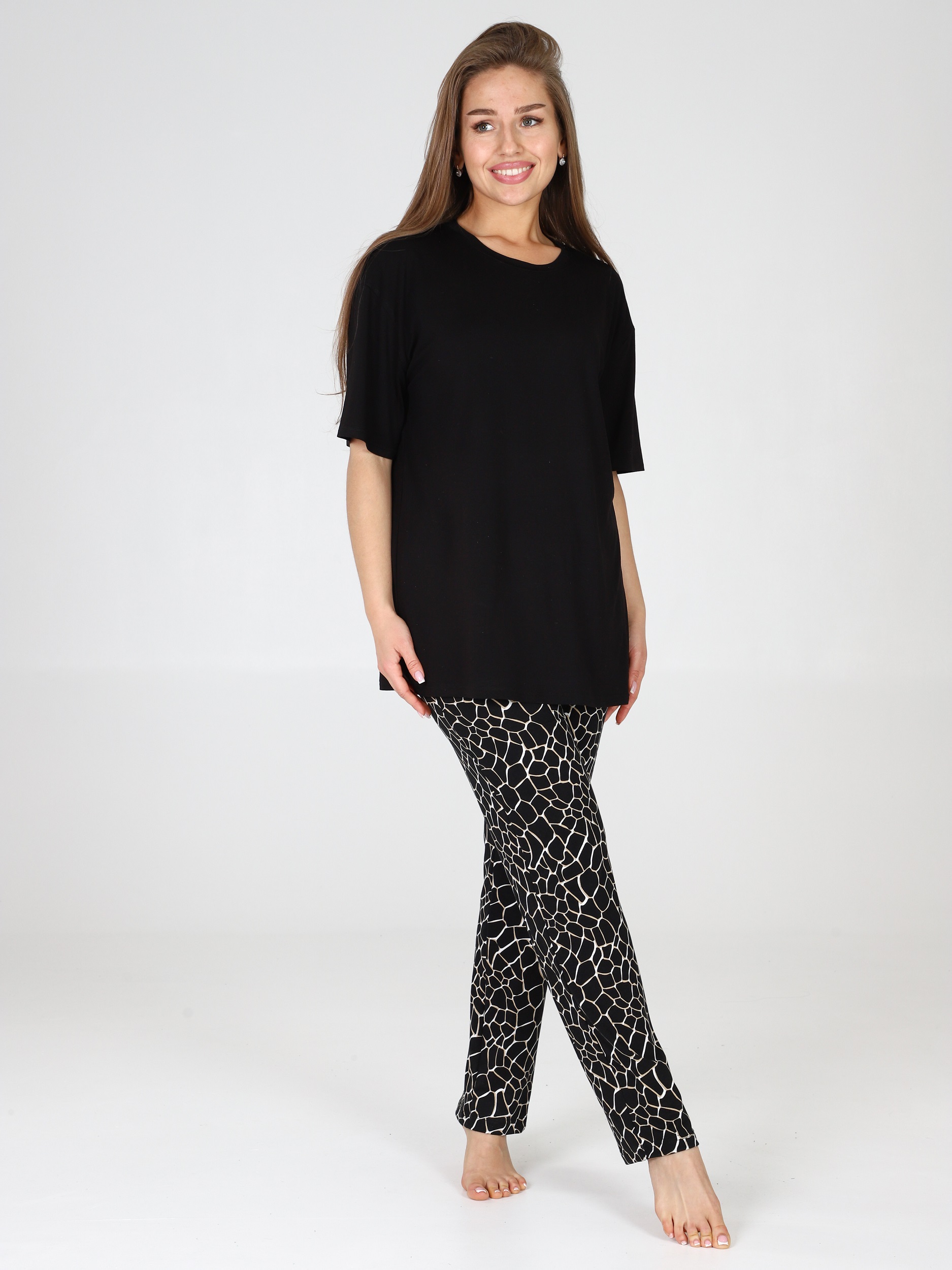 Костюм для женщин состоит из удлиненной футболки в стиле oversize и брюк. Модная свободной формы футболка со спущенным рукавом и прямые брюки с посадкой по талии будут незаменимыми вещами в путешествии , а также заменят пижаму и домашнюю одежду на даче.