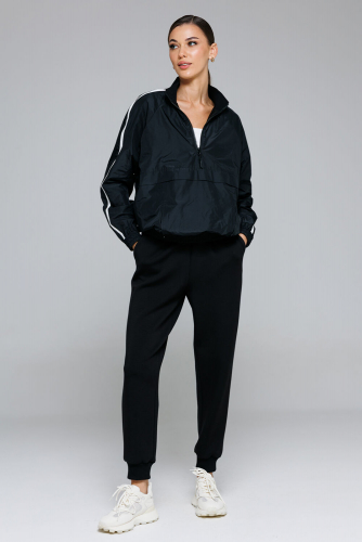 Жакет спортивный,удлиненный. Жакет прямого силуэта, с втачным двух шовным рукавом, и 2 -мя горизонтальными складками, на одном из рукавов накладной карман с клапаном, внизу рукав на притачной отстроченной манжете на резинке. Полочка с застежкой на тракторную тесьму-молнию, с кокеткой с печатью и накладным карманом. Спинка с кокеткой. По переду и спинки кулиса со шнурком. По низу парки вставлена эластичная тесьма с фиксаторами. Парка с капюшоном цельнокроеным со стойкой и вставленной в него эластичной тесьмой с фиксаторами. Полочка и спинка на трикотажной подкладке (сетка).