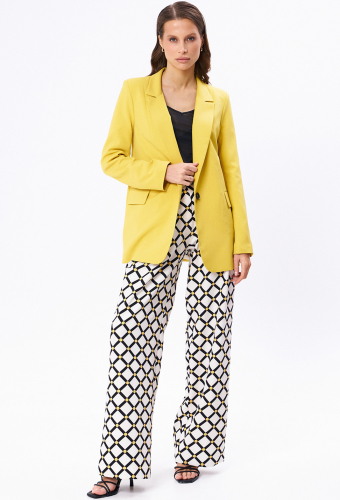Жакет прямой, без центральной бортовой застёжки. По переду жакета два прорезных кармана с клапаном,