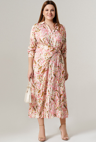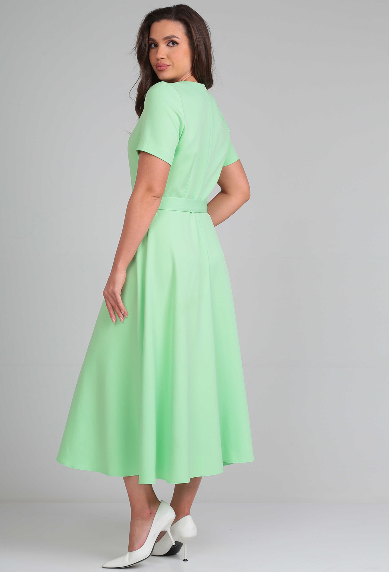 Платье полуприлегающего силуэта. Вырез горловины V - образный. Рукав короткий, по линии талии платье отрезное. Юбка полусолнце-клёш. По талии съёмный пояс, который регулируется с помощью пряжки и люверсов. По спинке втачана потайная тесьма-молния. Ткань приятная к телу.