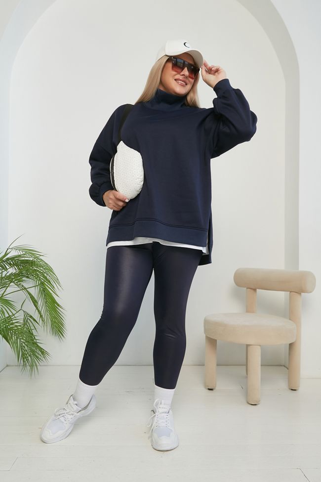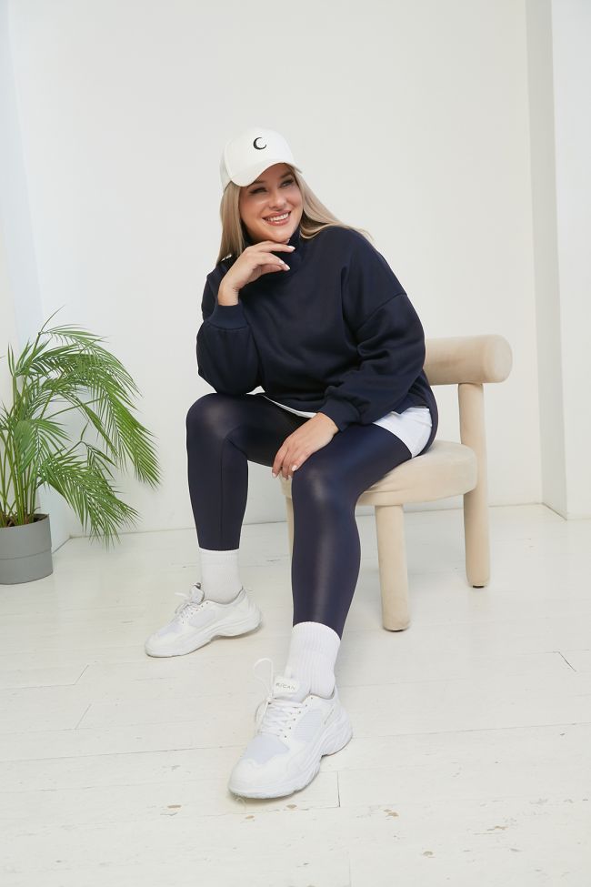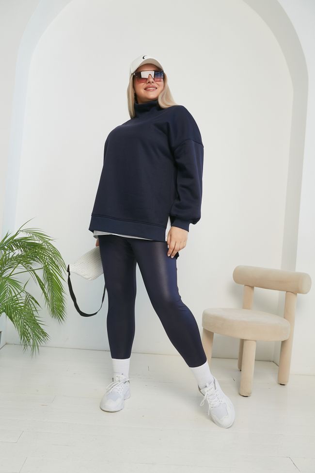 темно-синий Стильные леггинсы из трикотажной ткани "под кожу", с комфортной высокой посадкой на талии. Верх с эластичным поясом. Модель замечательно дополнит туника или удлиненная блуза.
