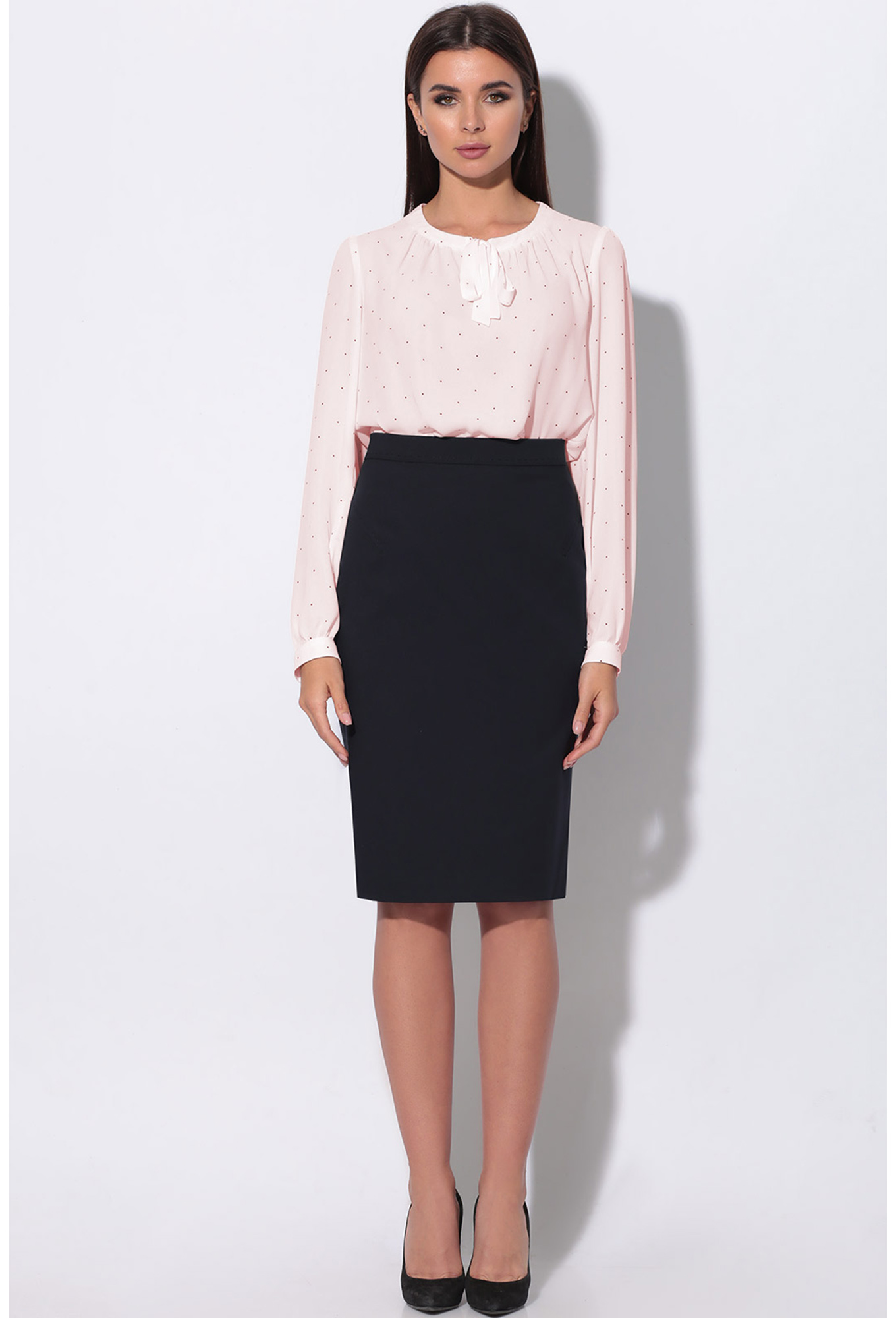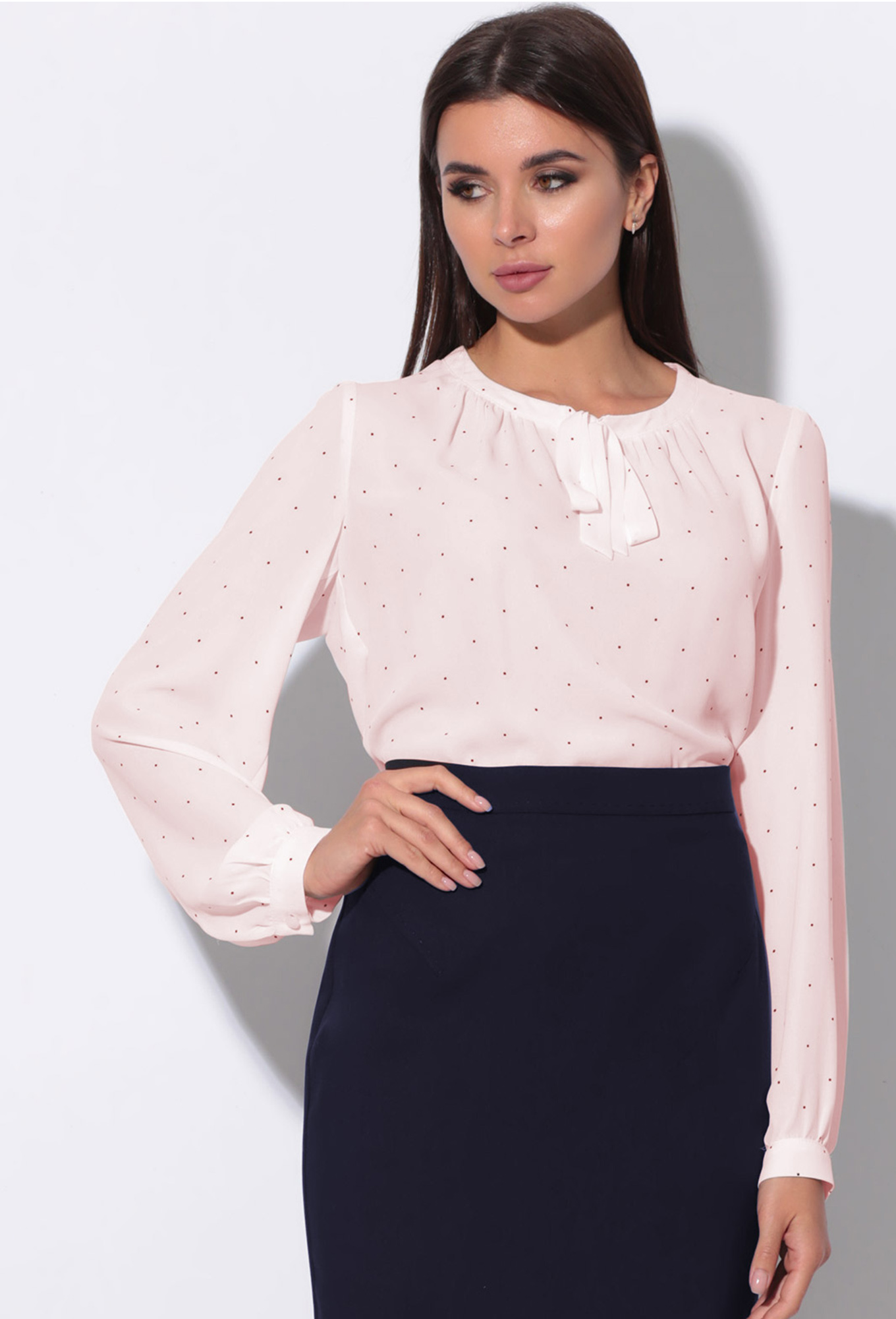 Блуза женская полуприлегающего силуэта со сборкой по горловине и V-образным вырезом.Рукав длинный втачной со сборкой по окату и притачной манжетой.По горловине декоративная планка переходящая в завязку-бант. Цвет блузы на доп. фото.