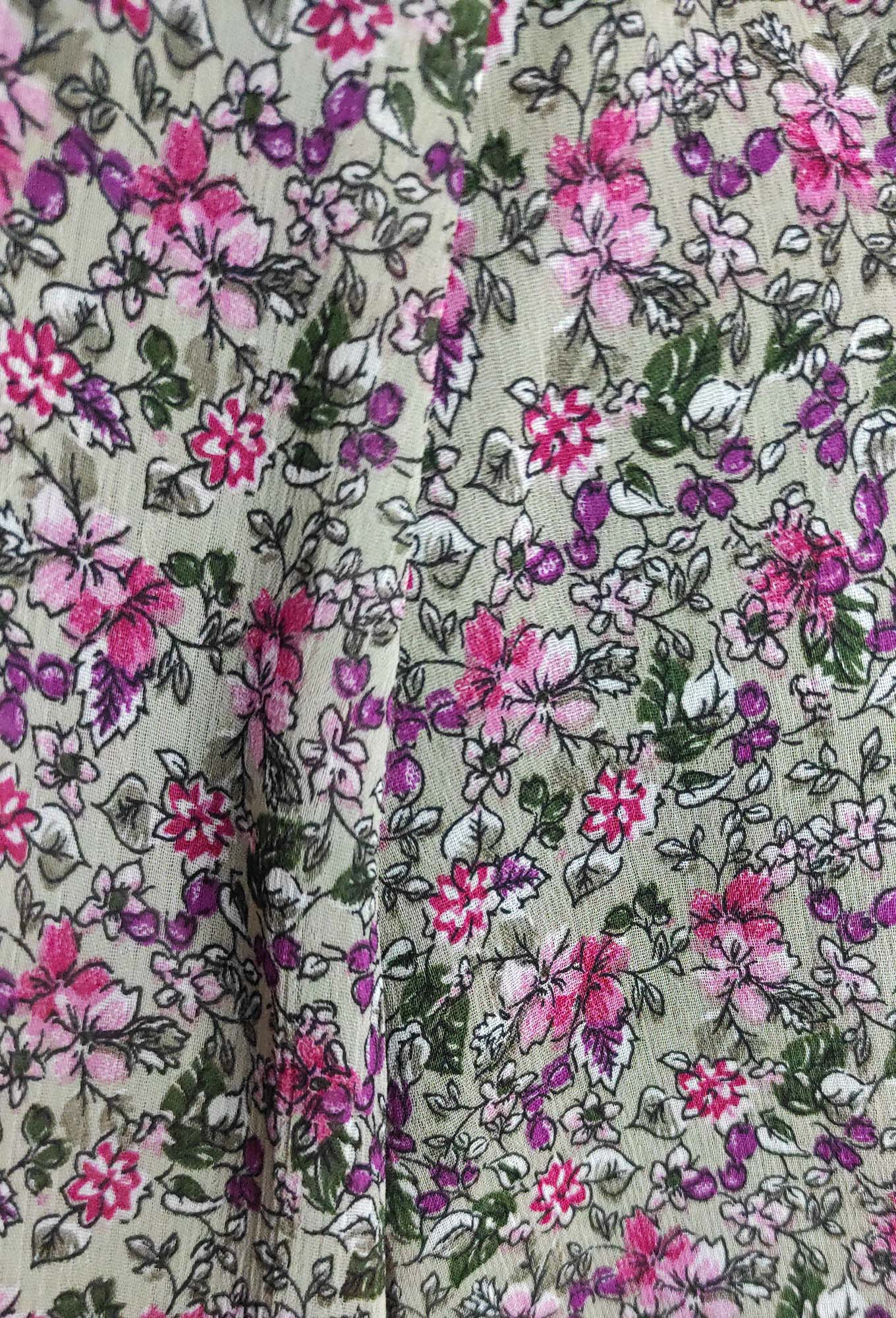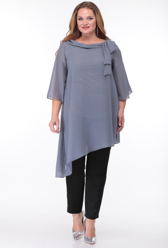 Блуза из креп-шифона с цветочным дизайном. Рукав реглан, 3/4 на резинке по низу. Застежка центральная бортовая с цельнокроеной планкой застегивающаяся на потайные петли-пуговицы, вырез горловины круглый с притачной планкой и сборкой по горловине.
